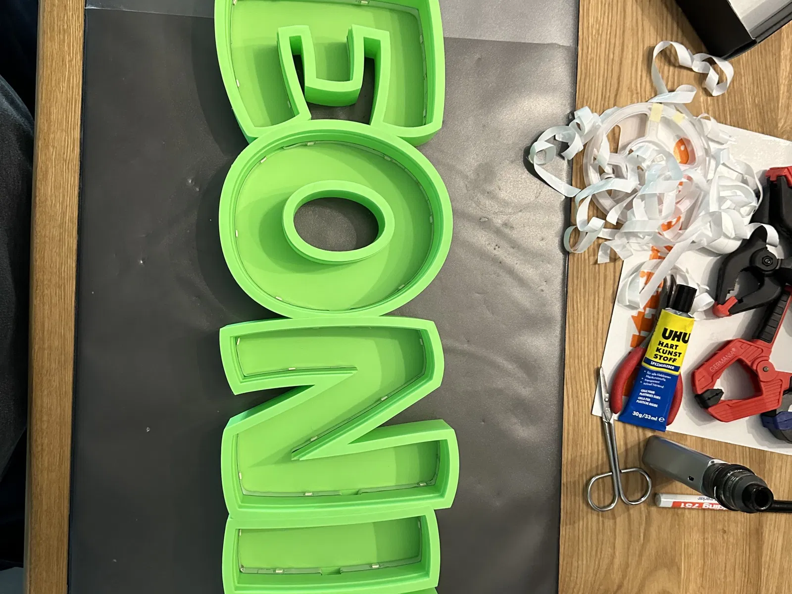 Leonie như một đèn tên LED có thể in được. In từng chữ cái riêng lẻ, để dán cùng với cáp tổng thể