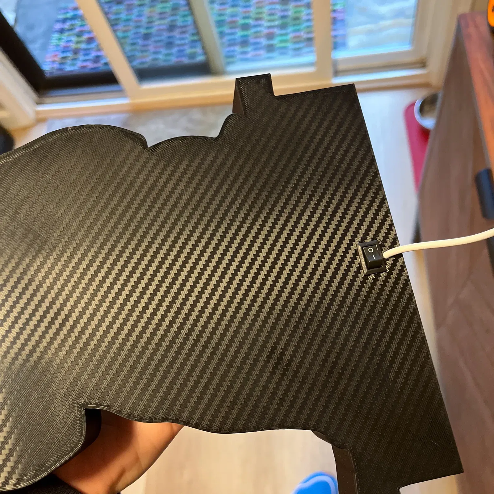 - Mặt sau vừa khít vào mặt trước. Bạn có thể dán nếu cần. Mặt sau có một lỗ cho dây và một công tắc rocker mini.