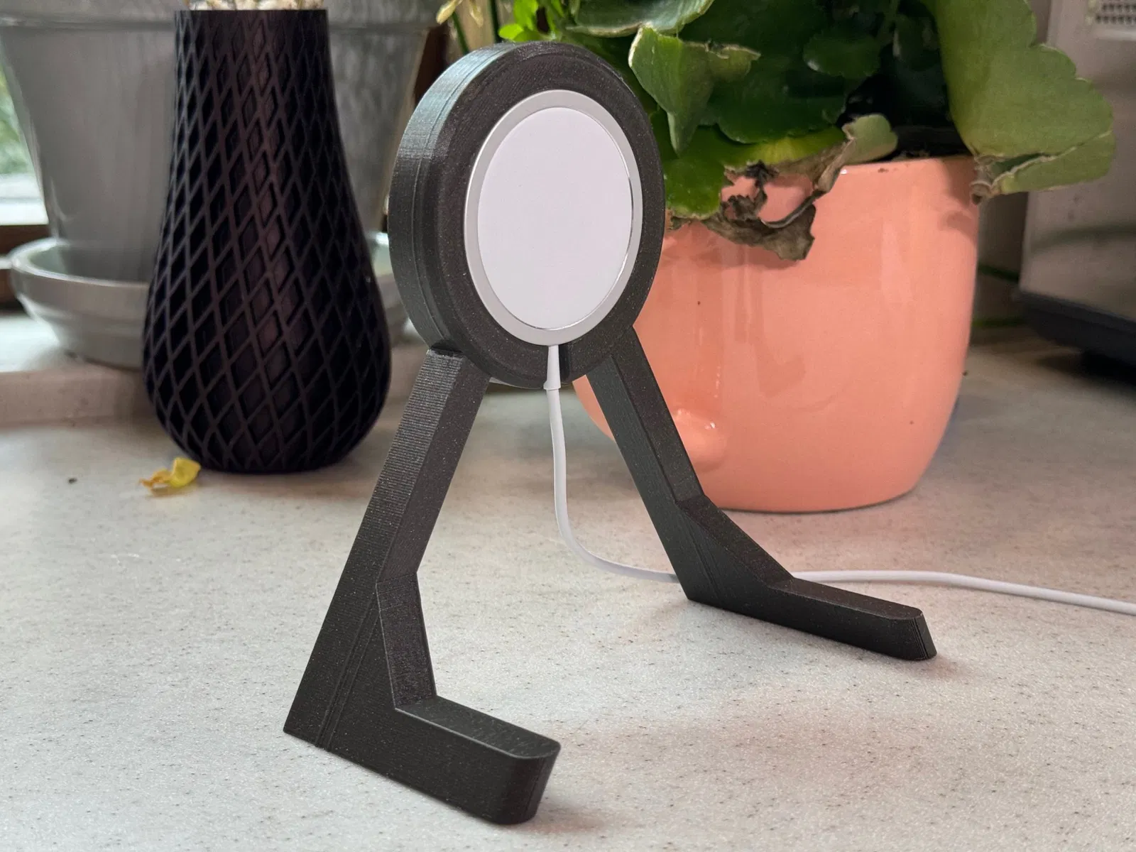 Đây là một bàn cạnh giường cho iPhone của Apple tương thích với bộ sạc MagSafe. Đây là một bản in dễ dàng và không cần hỗ trợ nào. Bộ sạc MagSafe của Apple cần được đẩy vào vị trí trong bản in khi hoàn thành in (xin vui lòng xem hình ảnh cuối cùng.) Các kích thước là rất chặt chẽ và đây là một kiểu lắp ghép. Kiểu lắp ghép được thiết kế để chặt chẽ. Sử dụng lỗ ở phía sau để đẩy bộ sạc MagSafe ra nếu bạn muốn tháo nó ra.