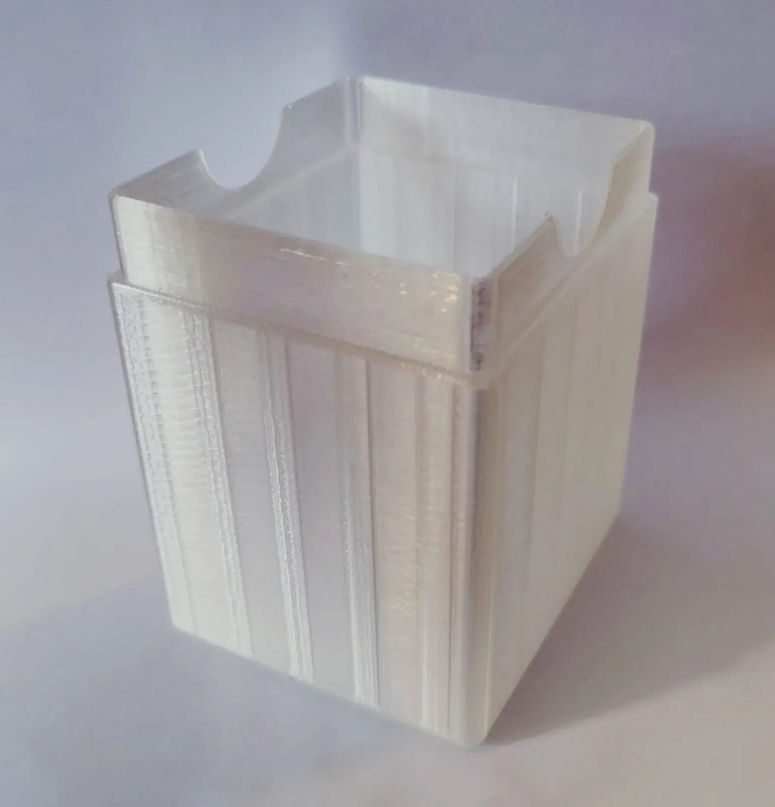Lưu ý rằng bản in được hiển thị được in bằng một loại filament trong suốt và các sọc là mẫu lấp đầy hiện lên. Mô hình rất mượt mà.