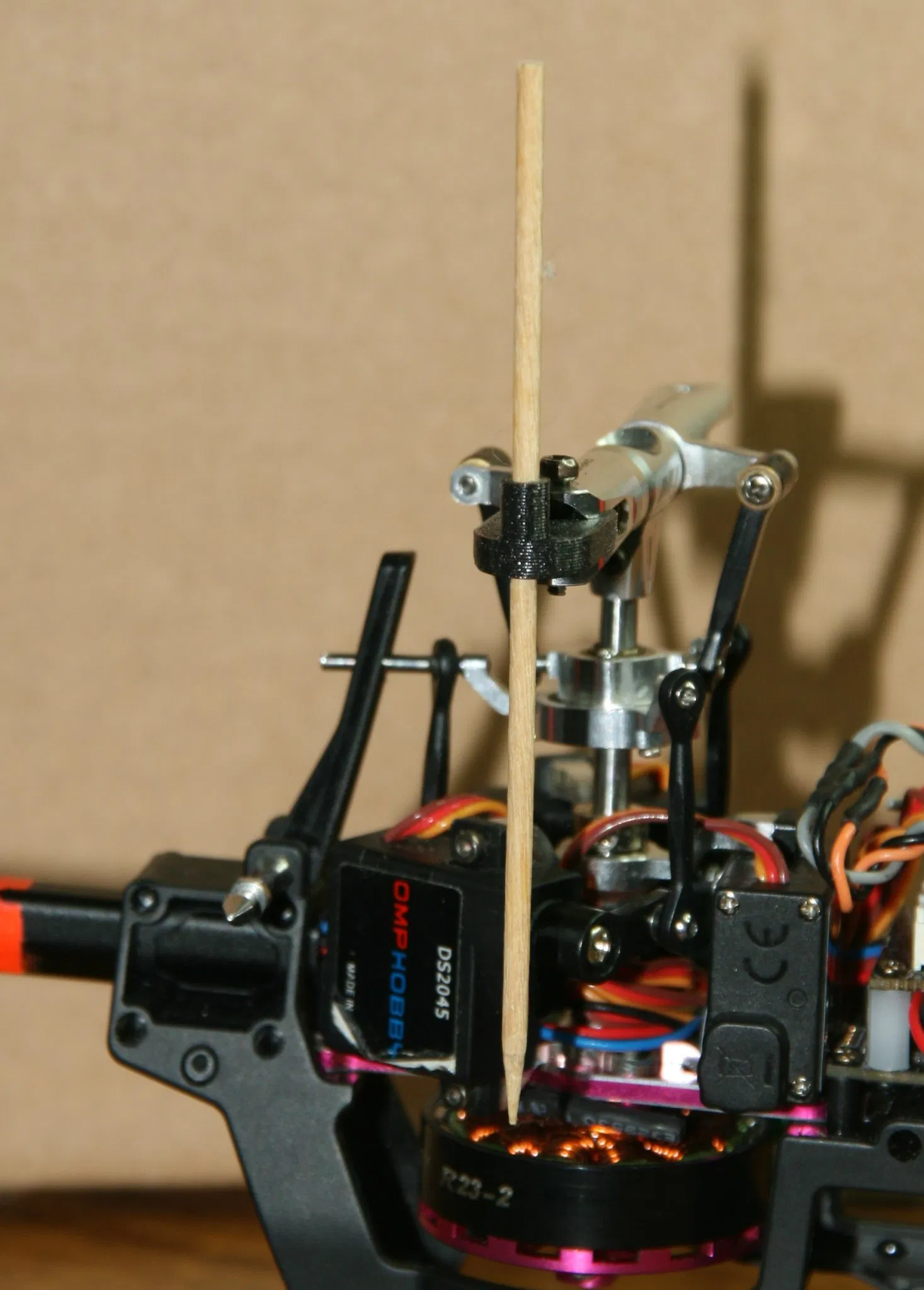 Xoay đầu rotor cho đến khi thanh liên kết tay cầm cánh quạt của công cụ nằm ngay trên tay điều khiển đĩa phía sau. Sau đó điều chỉnh điểm giữa của servo phía sau cho đến khi que cocktail song song với trục chính của trực thăng. Điều này thiết lập độ nghiêng bằng không. Gỡ bỏ que cocktail.
