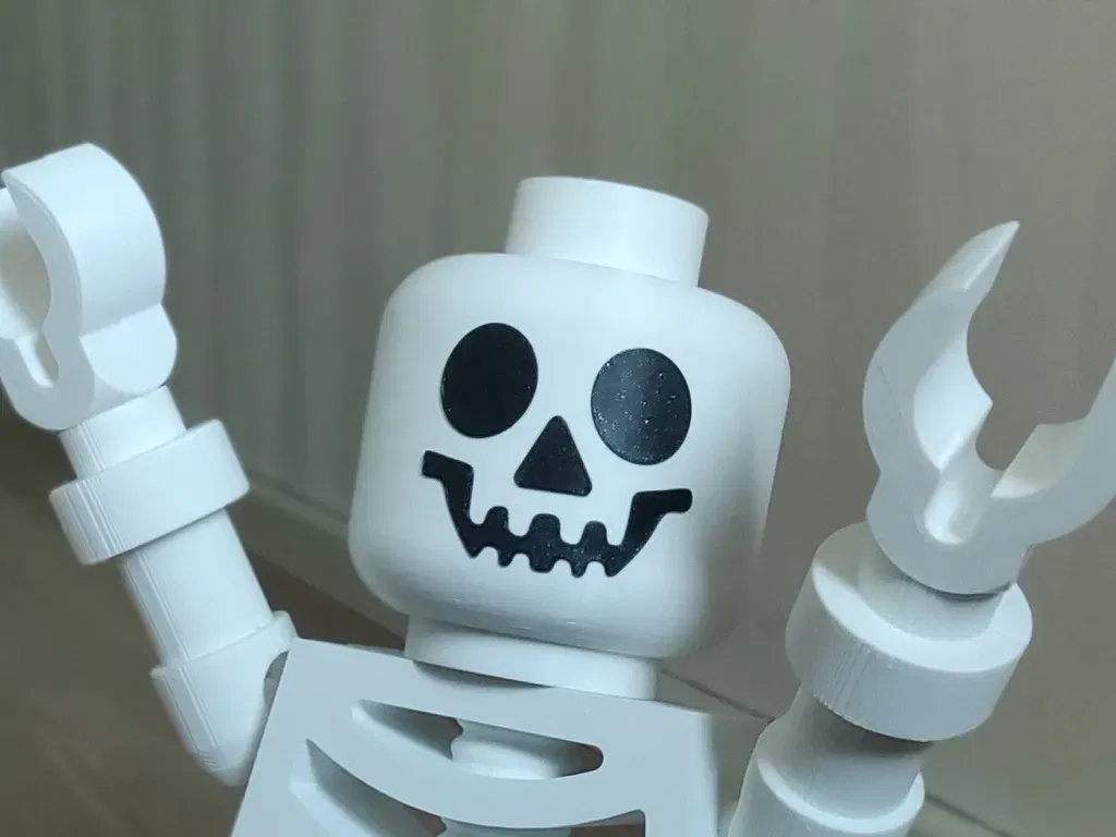 Phiên bản decal phẳng (0.4mm) giống như mặt của bộ xương Lego khổng lồ được điều chỉnh kích thước để có kích thước chính xác khi quấn quanh đầu bộ xương (in bằng PLA và sử dụng máy sấy tóc). Tôi đã gắn nó bằng băng dính hai mặt mỏng.