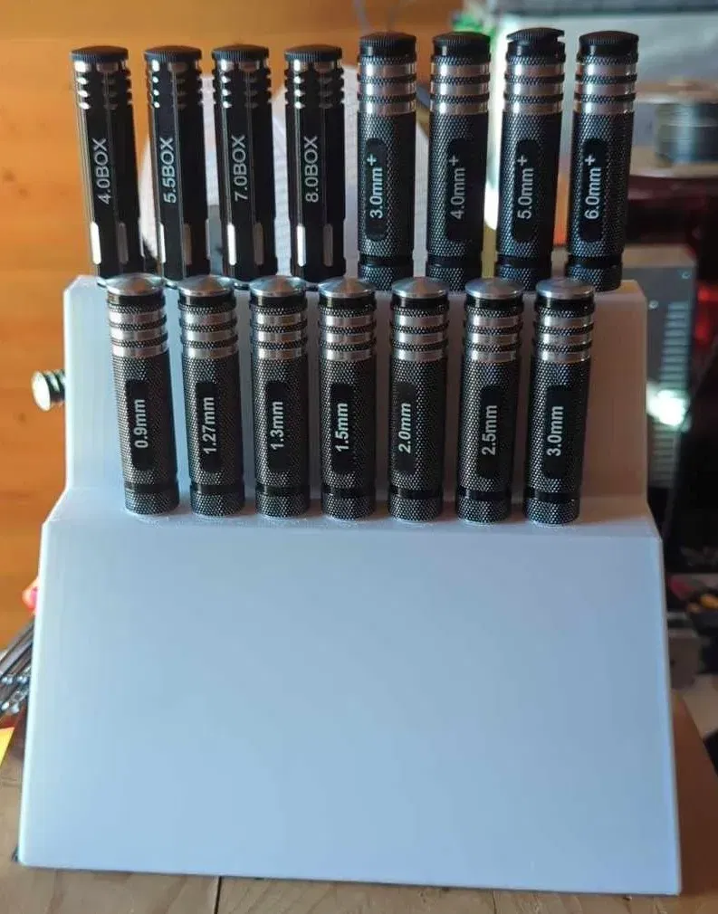 Được thiết kế để giữ trình điều khiển tiêu chuẩn cho RC hoặc máy in (ảnh là một bộ trình điều khiển hạt, trình điều khiển vít và cờ lê hex)