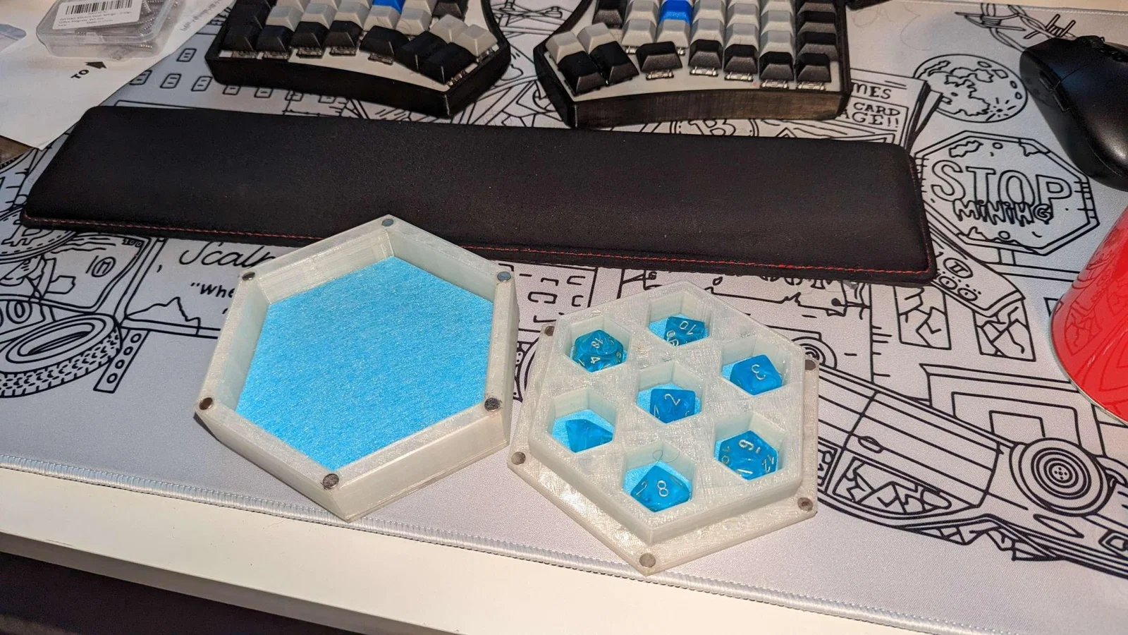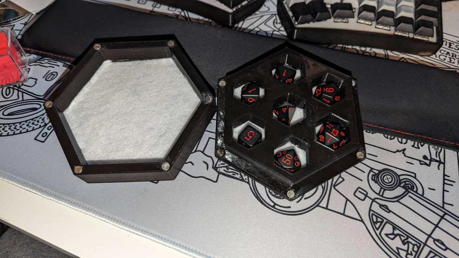Để giảm tiếng ồn và bảo vệ xúc xắc, khay và lỗ xúc xắc có thể được lót bằng vải nỉ. Tôi sử dụng một ít keo siêu dính để giữ nam châm, nhưng đã có các nguyên mẫu với keo nóng giữ tốt 1.5 năm sau.