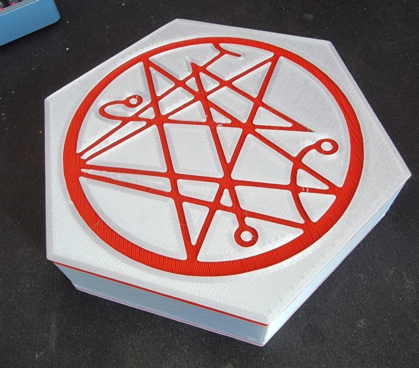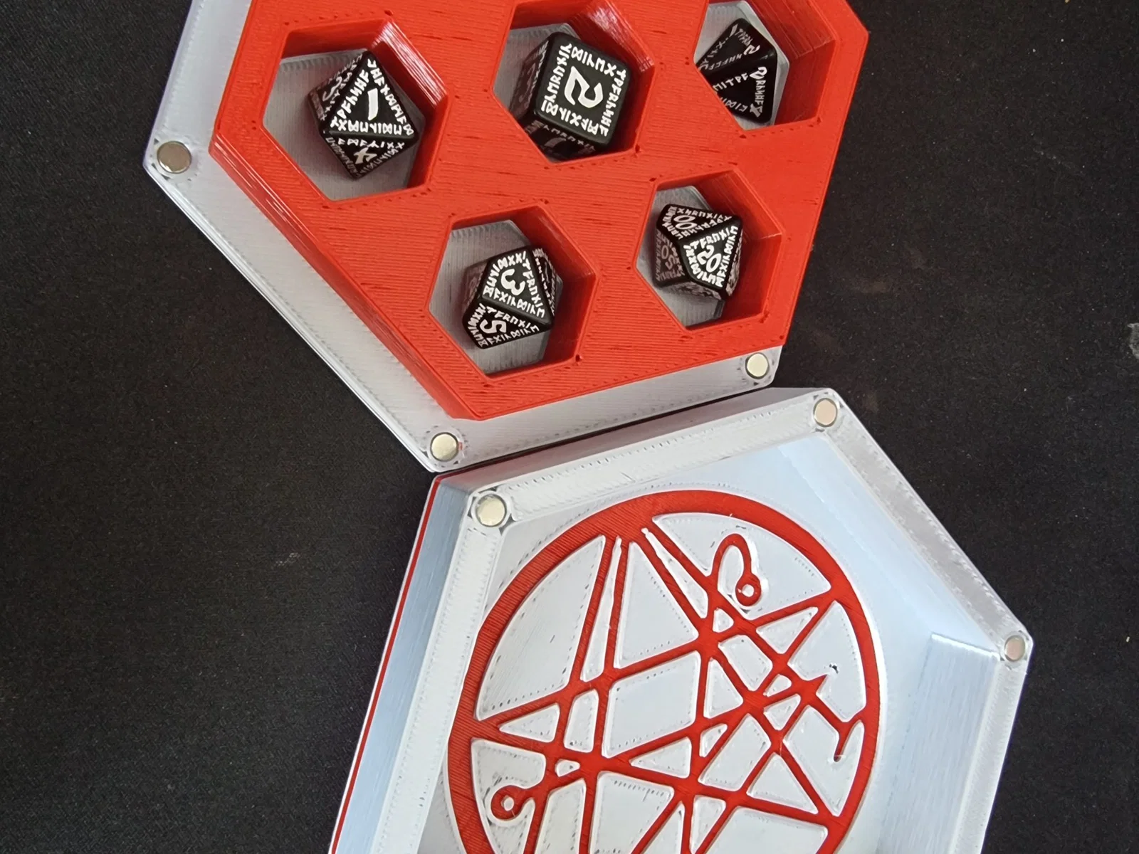 Hộp xúc xắc với khay. Biểu tượng Necronomicon ở trên, dưới và bên trong. Bạn sẽ cần 12 nam châm 5x2mm.
