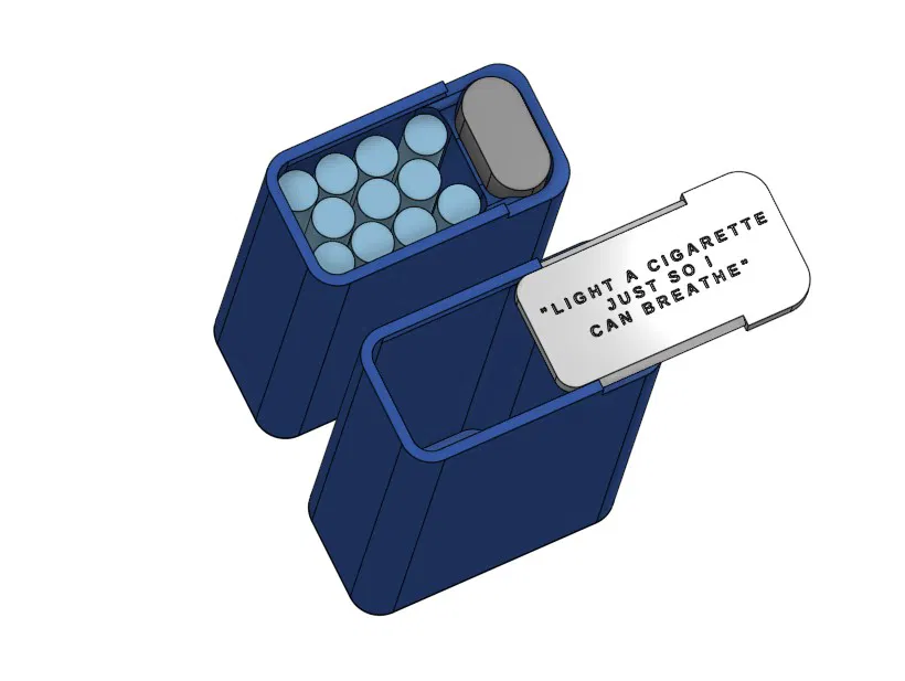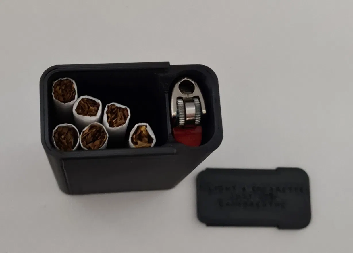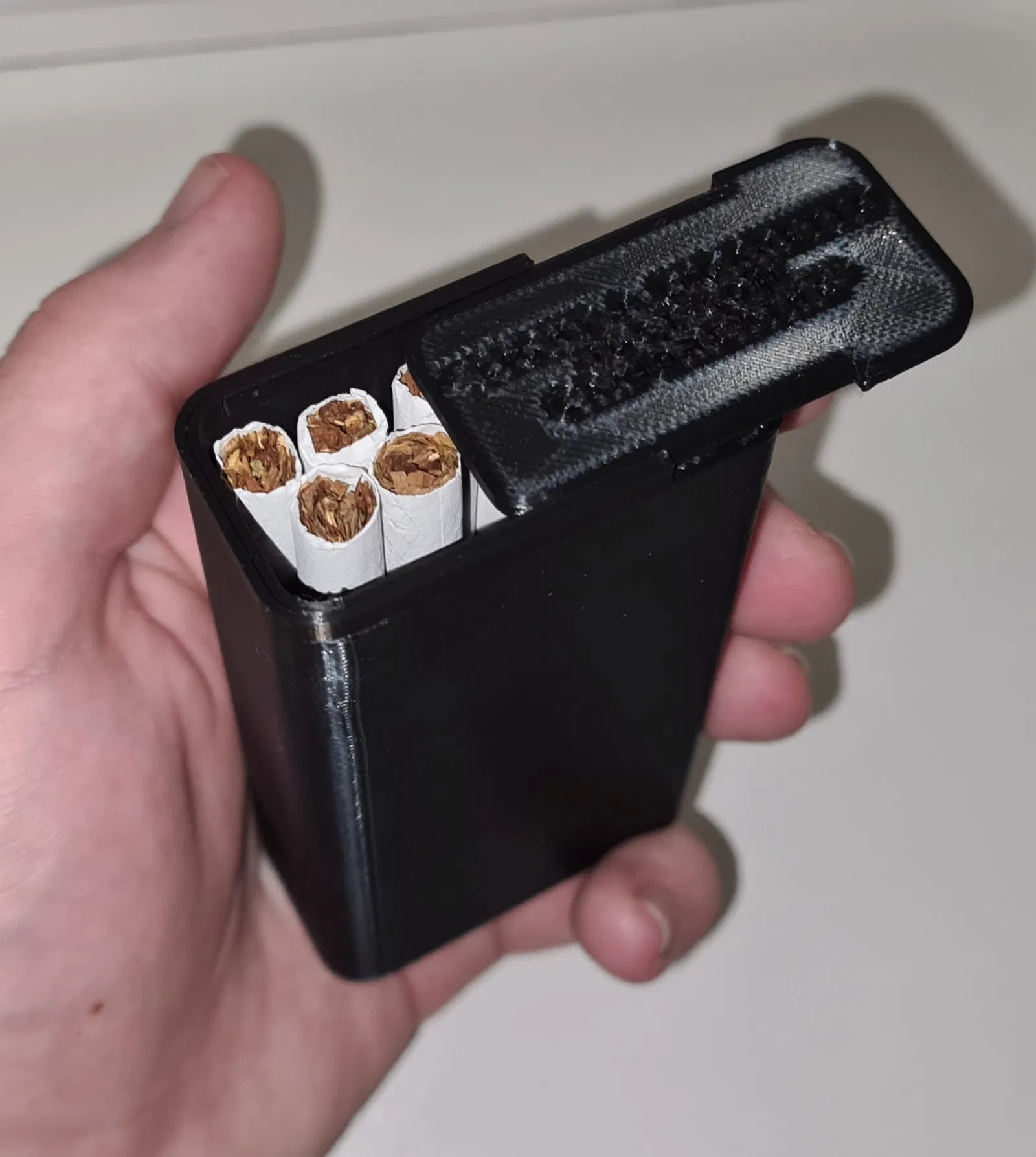 Hộp đựng được 10-12 điếu thuốc và một bật lửa BIC/Clipper cỡ vừa, có ngăn riêng cho bật lửa. In bằng PLA trên Ender 3 V2. Có phiên bản nắp hộp với lời bài hát và thiết kế dễ cầm hơn.