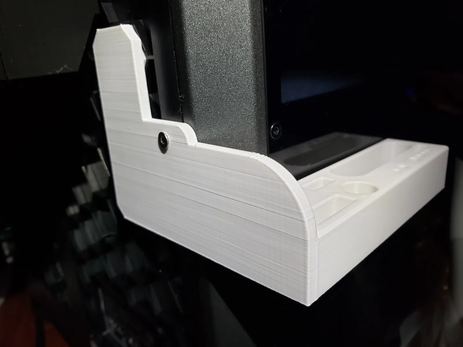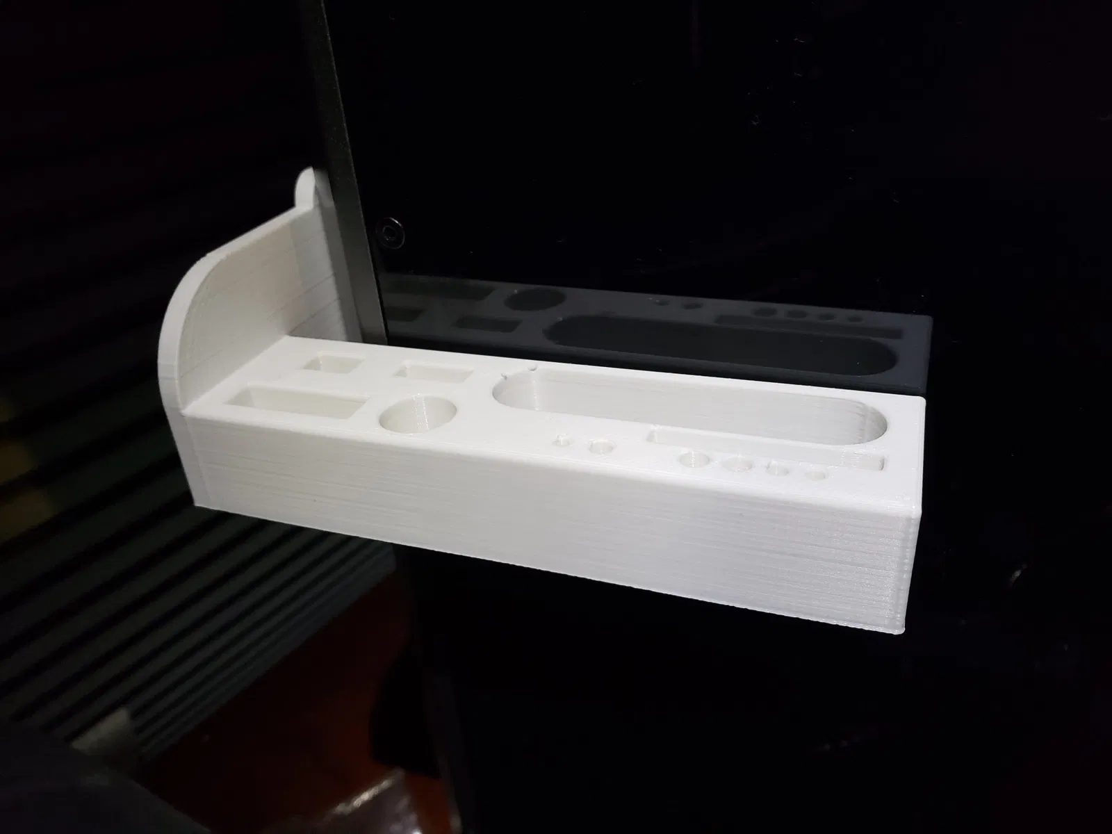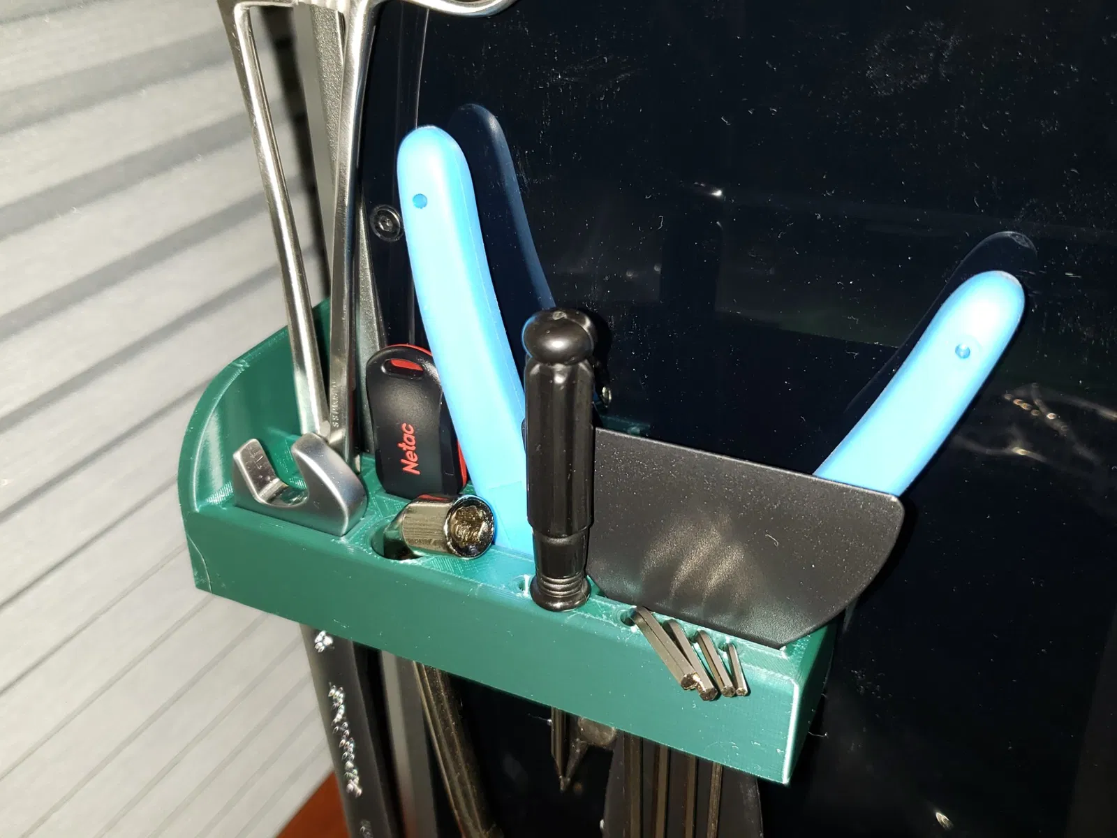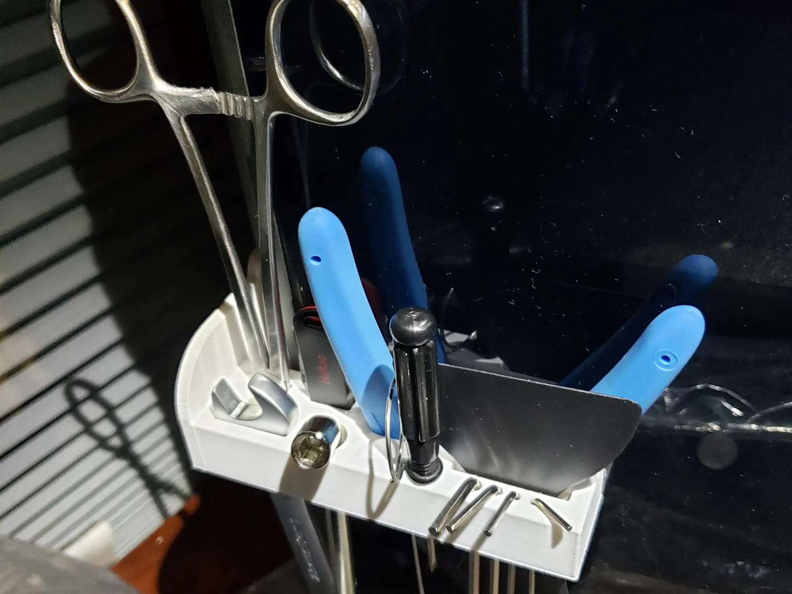 Bản gốc, “Giá đỡ công cụ Creality k1”, có một phụ kiện khối lục giác kẹp vào cung cấp hỗ trợ vững chắc mà không cần thay đổi máy in. Các công cụ được hỗ trợ bởi bản gốc gần giống với những gì tôi sử dụng, nhưng không hoàn toàn giống (ví dụ, tôi sử dụng kẹp liên tục). Tôi cũng không thích cái cạo treo bên hông, và tôi cần cái cờ lê để thay đổi vòi phun. Tôi đã thêm một khe cho cái cạo mà không làm tăng chiều rộng của giá đỡ, điều này làm cho bức tường giữa cái cắt chéo và cái cạo khá mỏng, nhưng nó không thực sự mang tính cấu trúc và dường như hoạt động tốt.