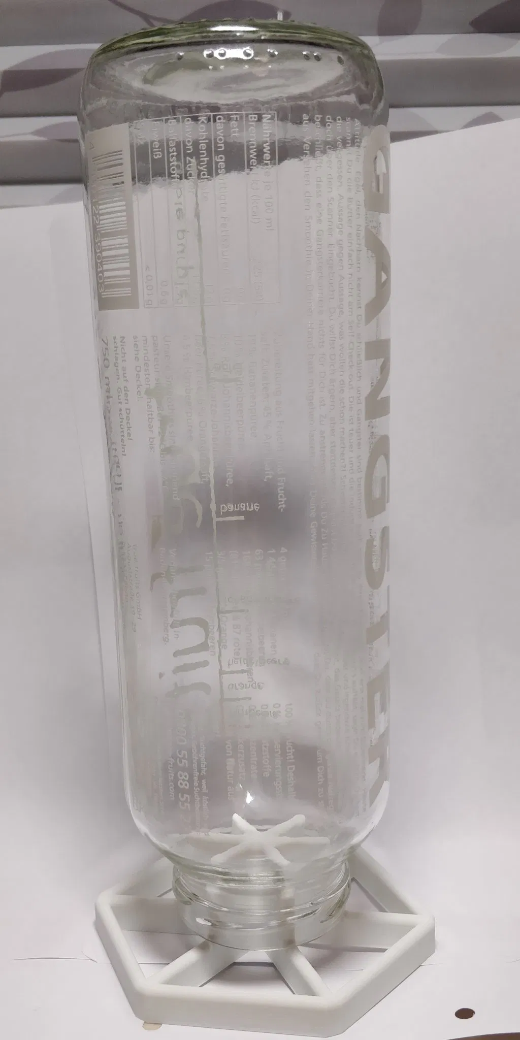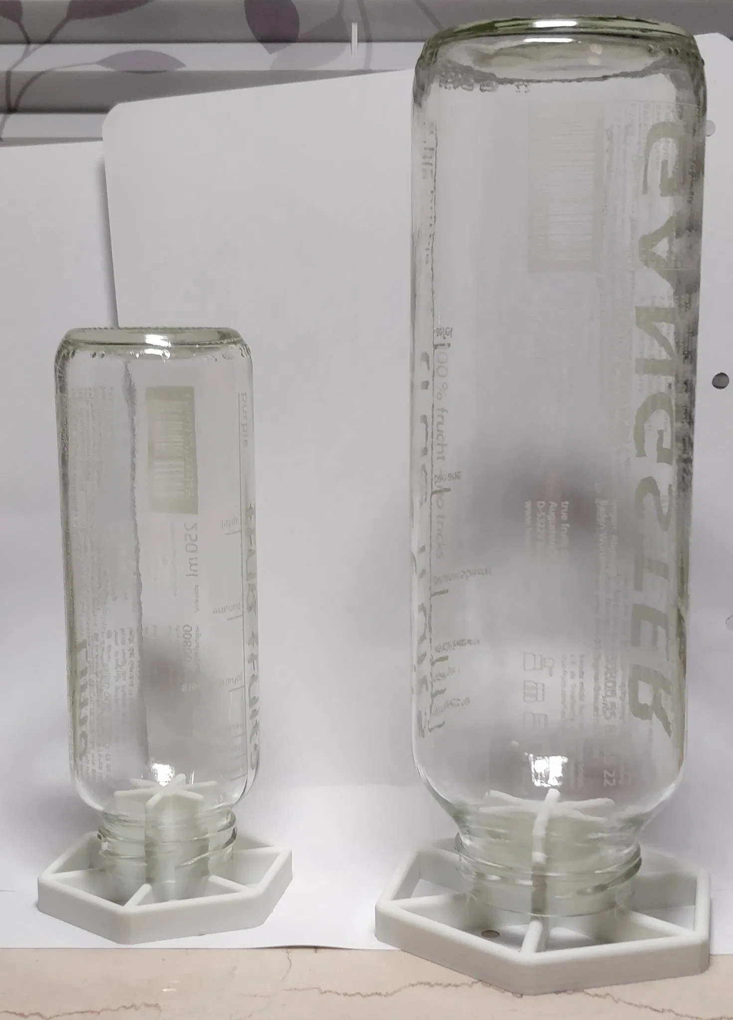 Tôi có một bộ sưu tập nhỏ các chai true fruits và tôi sử dụng lại chúng thường xuyên. Tôi muốn có một giá phơi cho chúng giống như cái mà tôi đã thiết kế cho các chai Soda Stream. Vì vậy, tôi đã điều chỉnh thiết kế để phù hợp với các chai true fruits.