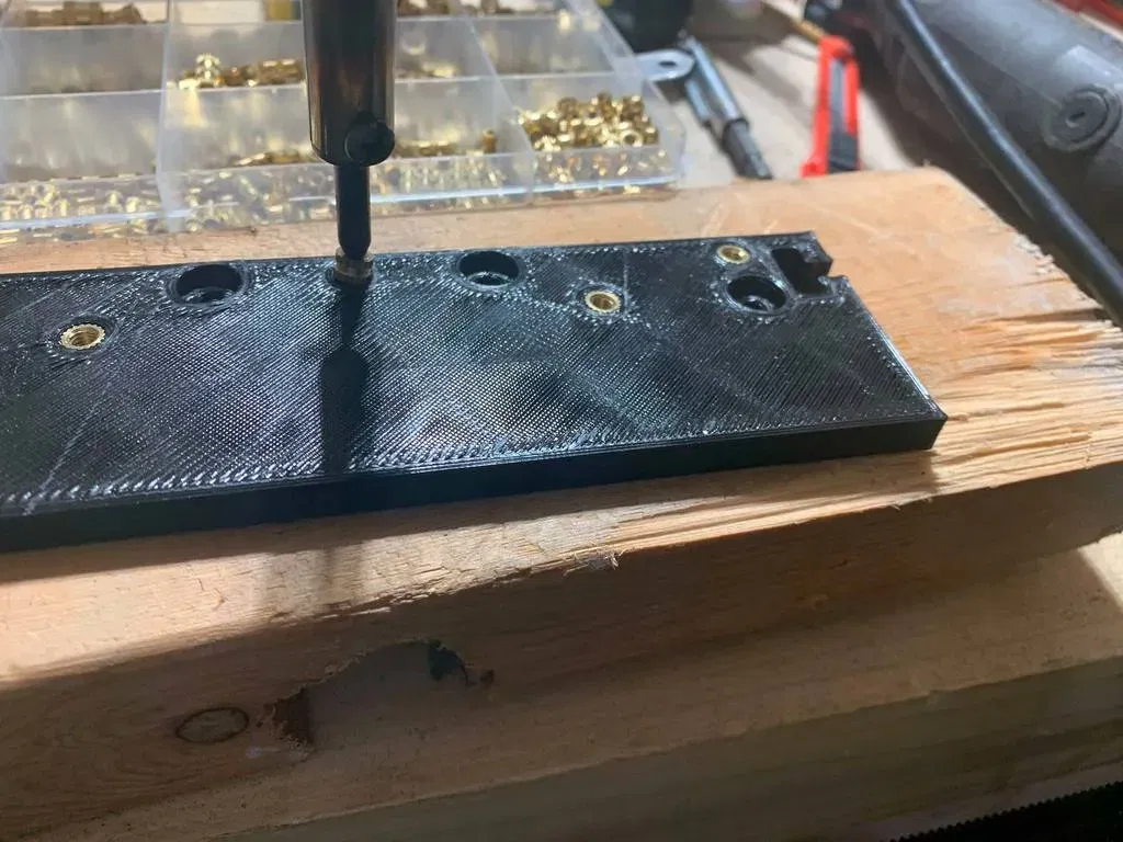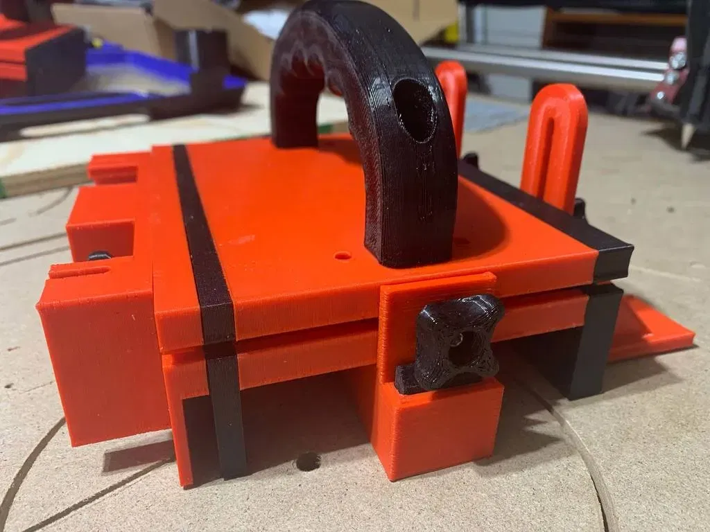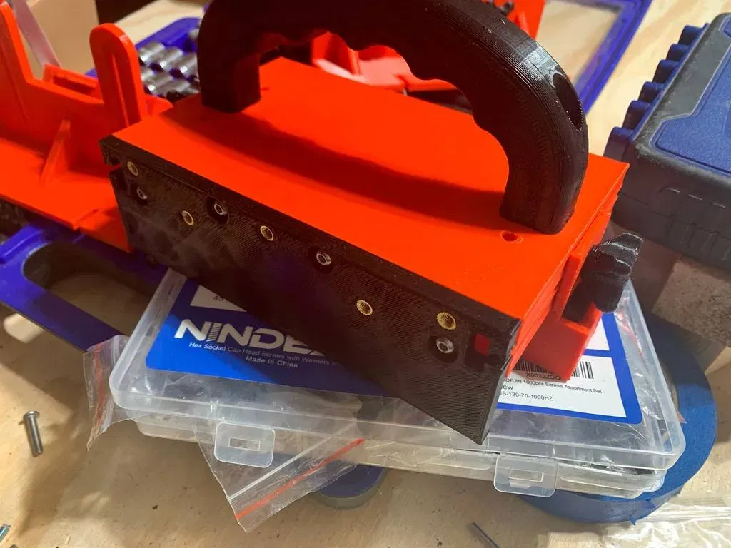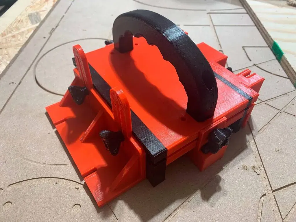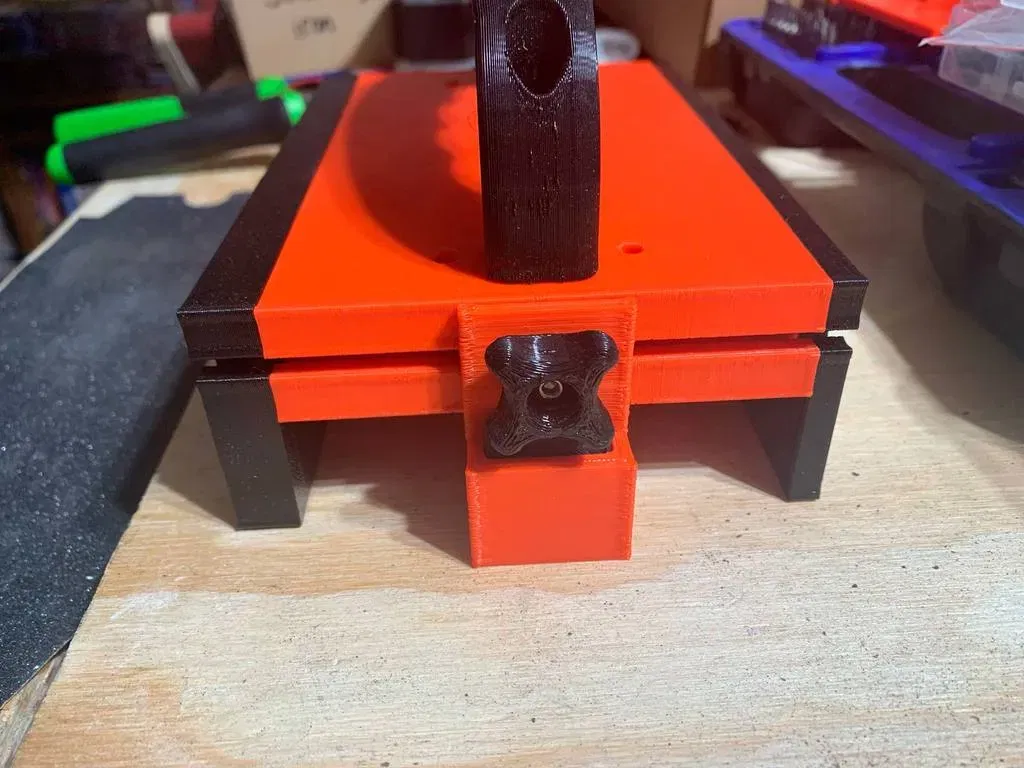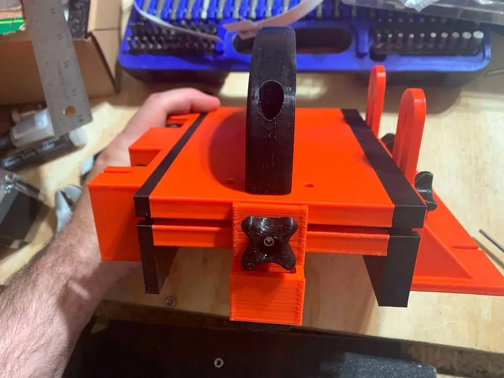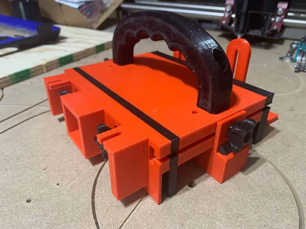 ### Tại sao lại có các chốt ren ở một số vị trí? Trên khối đẩy đầu tiên mà tôi đã làm (thiết kế gốc của Trobinou), các đai ốc nhiệt được đặt trong các giếng sâu và do đó đôi khi khó để có thể thẳng hàng, khiến cho vít tiếp cận chúng sai cách và bị chéo ren, và kết quả là tôi đã có một số giếng nhựa in bị mài mòn và không thể giữ chặt đai ốc. Tôi rất thích việc sử dụng các chốt ren thay vì đai ốc, không phải ở khắp mọi nơi, nhưng ở các bên, nơi mà nó thực sự hữu ích. Thiết kế này sử dụng các chốt ren M4x4x6 ở các bên mỏng hơn, và nó có thể sử dụng những cái đó, hoặc những cái dài hơn, M4x6x6, ở bên dày hơn. (Xem bên dưới để biết thêm chi tiết về các độ dày khác nhau của các bên được cung cấp trong remix này.) ### Cải tiến/thay đổi trong remix này: - Các núm đã được thiết kế lại để in mà không cần hỗ trợ ("Knob.stl" và "Knob_Bottom_Back.stl"). - Các bộ phận sau đây đều đã được chỉnh sửa để đáy ("Bottom.stl") có thể được tháo ra/thay thế mà không cần tháo tất cả các bộ phận khác (trong trường hợp bạn vô tình cắt vào đáy đủ nhiều lần đến mức bạn cần in lại nó): - Side.stl (thực tế là tất cả ba độ dày mới của các bên - xem bên dưới) - Side_Plate.stl - Router_Plate_v3.stl (được đặt tên trong phiên bản gốc là Router_Plate_v2.stl)