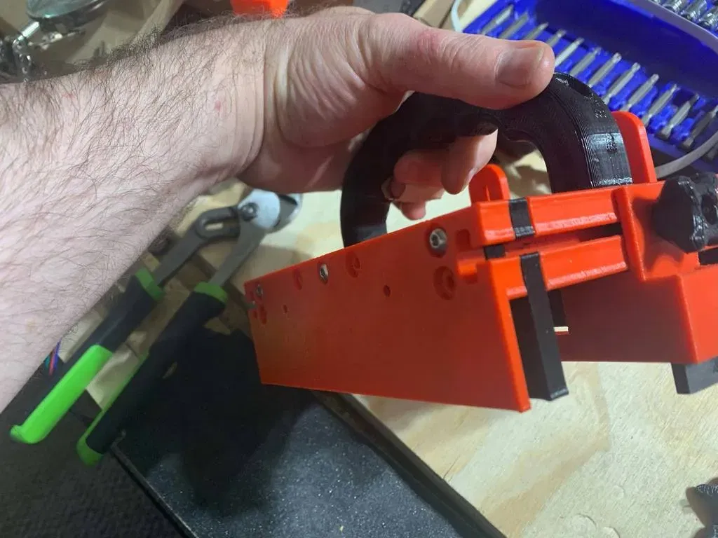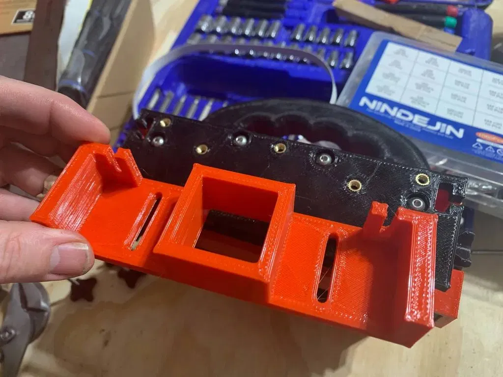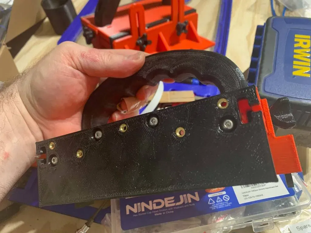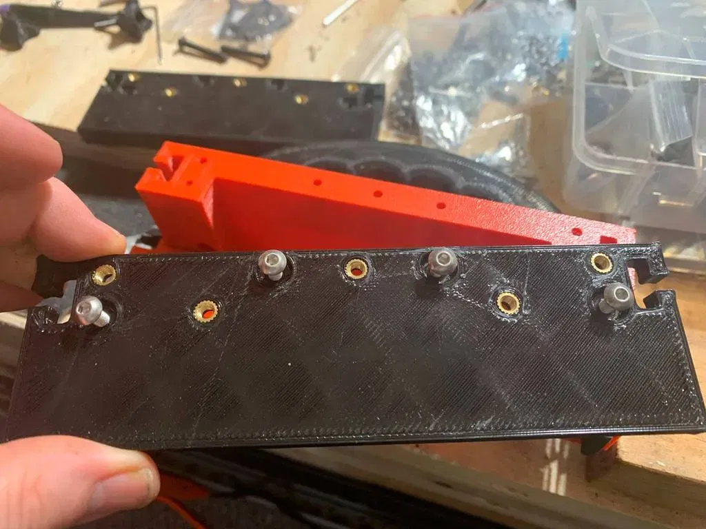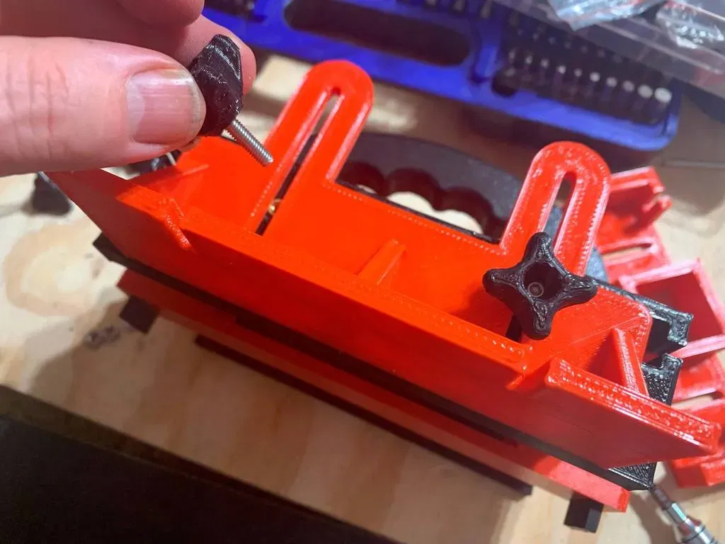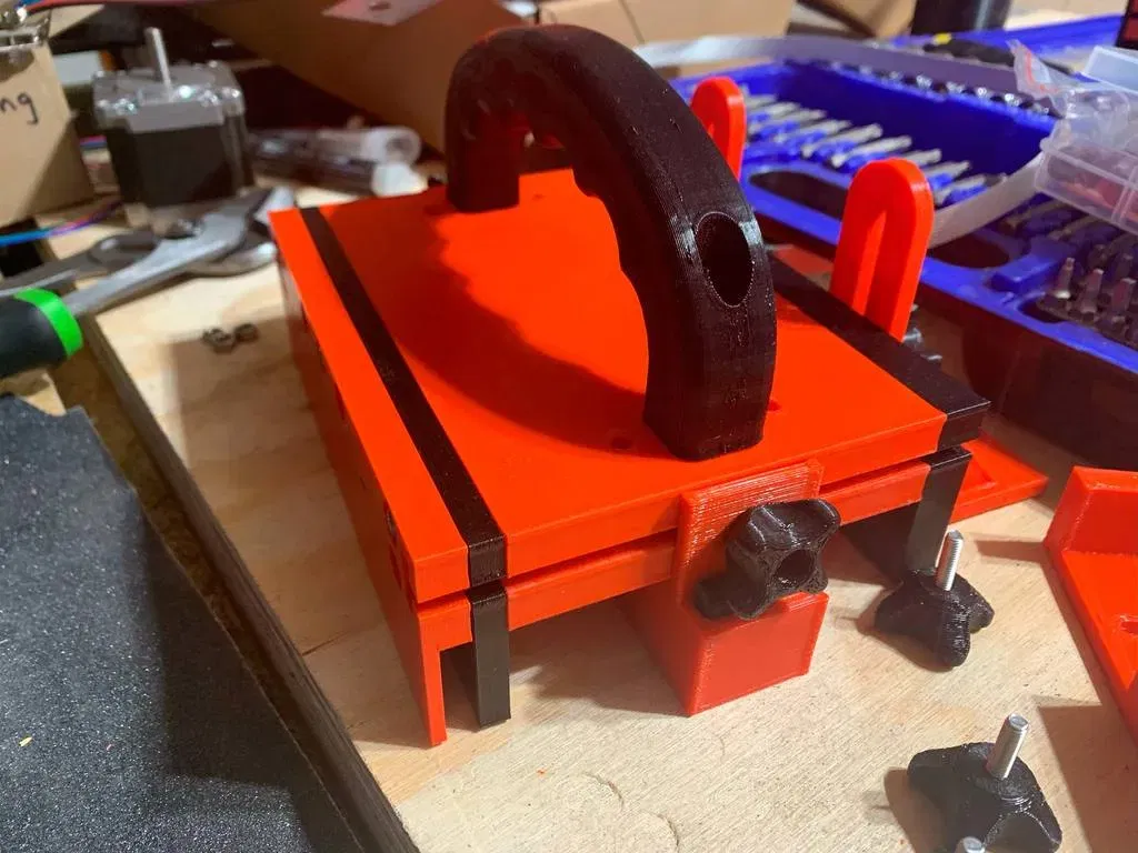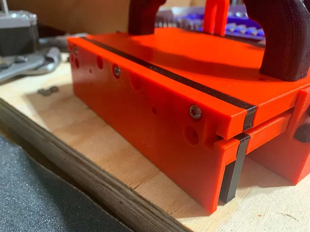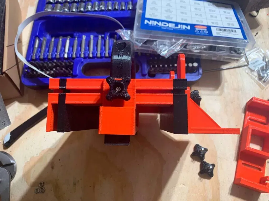 ### Tại sao lại có các chốt ren ở một số vị trí? Trên khối đẩy đầu tiên mà tôi đã làm (thiết kế gốc của Trobinou), các đai ốc nhiệt được đặt trong các giếng sâu và do đó đôi khi khó để có thể thẳng hàng, khiến cho vít tiếp cận chúng sai cách và bị chéo ren, và kết quả là tôi đã có một số giếng nhựa in bị mài mòn và không thể giữ chặt đai ốc. Tôi rất thích việc sử dụng các chốt ren thay vì đai ốc, không phải ở khắp mọi nơi, nhưng ở các bên, nơi mà nó thực sự hữu ích. Thiết kế này sử dụng các chốt ren M4x4x6 ở các bên mỏng hơn, và nó có thể sử dụng những cái đó, hoặc những cái dài hơn, M4x6x6, ở bên dày hơn. (Xem bên dưới để biết thêm chi tiết về các độ dày khác nhau của các bên được cung cấp trong remix này.) ### Cải tiến/thay đổi trong remix này: - Các núm đã được thiết kế lại để in mà không cần hỗ trợ ("Knob.stl" và "Knob_Bottom_Back.stl"). - Các bộ phận sau đây đều đã được chỉnh sửa để đáy ("Bottom.stl") có thể được tháo ra/thay thế mà không cần tháo tất cả các bộ phận khác (trong trường hợp bạn vô tình cắt vào đáy đủ nhiều lần đến mức bạn cần in lại nó): - Side.stl (thực tế là tất cả ba độ dày mới của các bên - xem bên dưới) - Side_Plate.stl - Router_Plate_v3.stl (được đặt tên trong phiên bản gốc là Router_Plate_v2.stl)