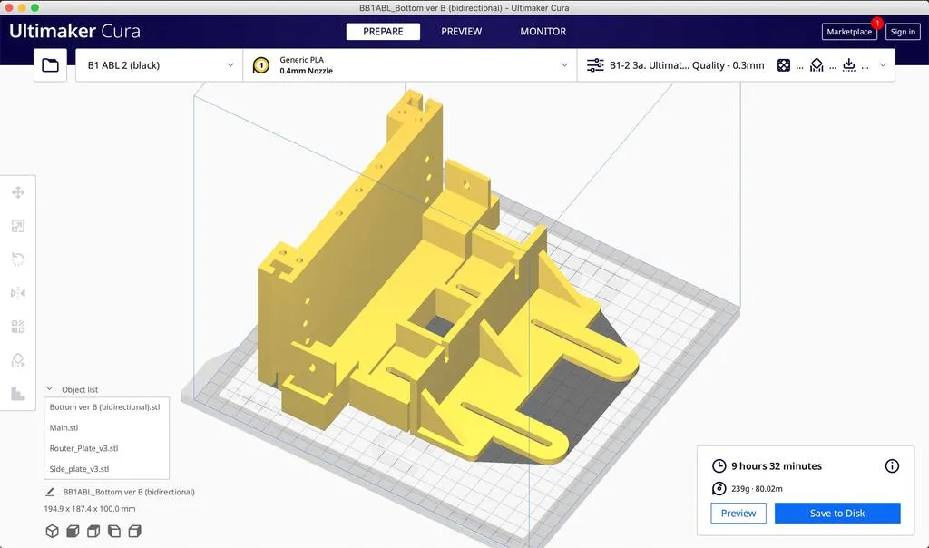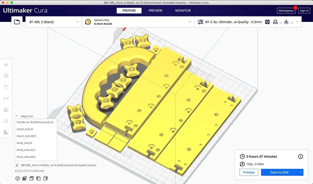 - In sáu (6) mảnh "Knob for M4 hex bolt or nut.stl" nếu bạn muốn có đủ để gắn "Side_Plate.stl," "Stabilizing_Plate.stl," và "Router_Plate_v3.stl." Điều này rất nhỏ, nhưng nhiều bộ phận của thiết kế gốc đã bị đảo ngược các mặt phẳng pháp tuyến, khiến eSlicer và có thể các slicer khác hiển thị một cảnh báo màu đỏ trên các bộ phận. Bản remix này đã sửa tất cả các mặt phẳng pháp tuyến đúng cách. Video lắp ráp trên YouTube (được tìm thấy liên kết trên bộ phận gốc) áp dụng cho hầu hết mọi thứ ở đây, với một số ngoại lệ nhỏ mà tôi nghĩ sẽ tự giải thích. Tuy nhiên, nếu bạn có bất kỳ câu hỏi hoặc vấn đề nào, hãy đăng một bình luận, và tôi sẽ cố gắng hết sức để trả lời. Như mọi khi, hãy sử dụng theo rủi ro của bạn. Mặc dù việc sử dụng một khối đẩy đúng cách làm cho việc cắt/gọt an toàn hơn, nhưng việc sử dụng máy cưa bàn, bàn router, hoặc máy cưa băng luôn mang theo một số rủi ro vốn có, một số trong số đó không thể hoàn toàn loại bỏ chỉ bằng cách sử dụng khối đẩy. Tôi không chịu trách nhiệm cho bất kỳ chấn thương nào xảy ra trong khi sử dụng thiết kế này. ### Ghi chú về cài đặt in tăng tốc của tôi: Tôi đã sử dụng phần cứng gốc của máy in (với đầu phun 0.4) với các cài đặt slicer đã được điều chỉnh không chỉ mô phỏng đầu phun 0.6, mà còn tăng tốc độ di chuyển (cả di chuyển in và không in), để tôi có được tốc độ in nhanh hơn nhiều, với chất lượng chấp nhận được cho những loại linh kiện mà chức năng quan trọng hơn so với các đường lớp tinh tế và độ chính xác tối đa. Thời gian in của tôi được minh họa trong một số ảnh chụp màn hình. Để tìm hiểu về thiết lập này, hãy xem 2 video YouTube được liên kết trong thiết kế vỏ máy in V1 và V2 của tôi, được liên kết bên dưới: - - ### Cài đặt In Máy in: BIQU B1 Giá đỡ: Không Hỗ trợ: Không Độ phân giải: 0.3 Lấp đầy: 15% Vật liệu in: Đen: Amazon Basics/Đỏ: Bumat PLA Đen và Đỏ Ghi chú: Để tìm hiểu thêm về thiết lập in tăng tốc/cài đặt slicer của tôi, hãy xem 2 video YouTube được liên kết trong thiết kế vỏ máy in V1 và V2 của tôi, được liên kết bên dưới: - - Danh mục: Dụng cụ cầm tay Hũ tiền tip PayPal của tôi: https://paypal.me/design8studio Nhiều phiên bản remix LowRider 3 CNC khác nhau: - Bộ sưu tập LowRider 3 CNC Xem tất cả mô hình và phiên bản remix của tôi trên F3D: - Mô hình 3D của Design8Studio *Liên kết sản phẩm Amazon là liên kết liên kết.