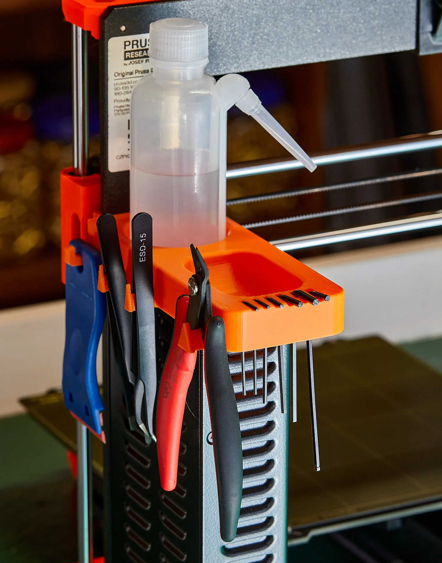 Giá đỡ công cụ này được thiết kế để phù hợp với khung tay phải của máy in Prusa MK3S, nằm trên đỉnh của bộ nguồn màu đen. Nó giữ tất cả các công cụ mà tôi sử dụng thường xuyên ở một nơi, giữ mọi thứ gọn gàng và ngăn nắp trong khi vẫn cho phép tiếp cận dễ dàng từng công cụ.