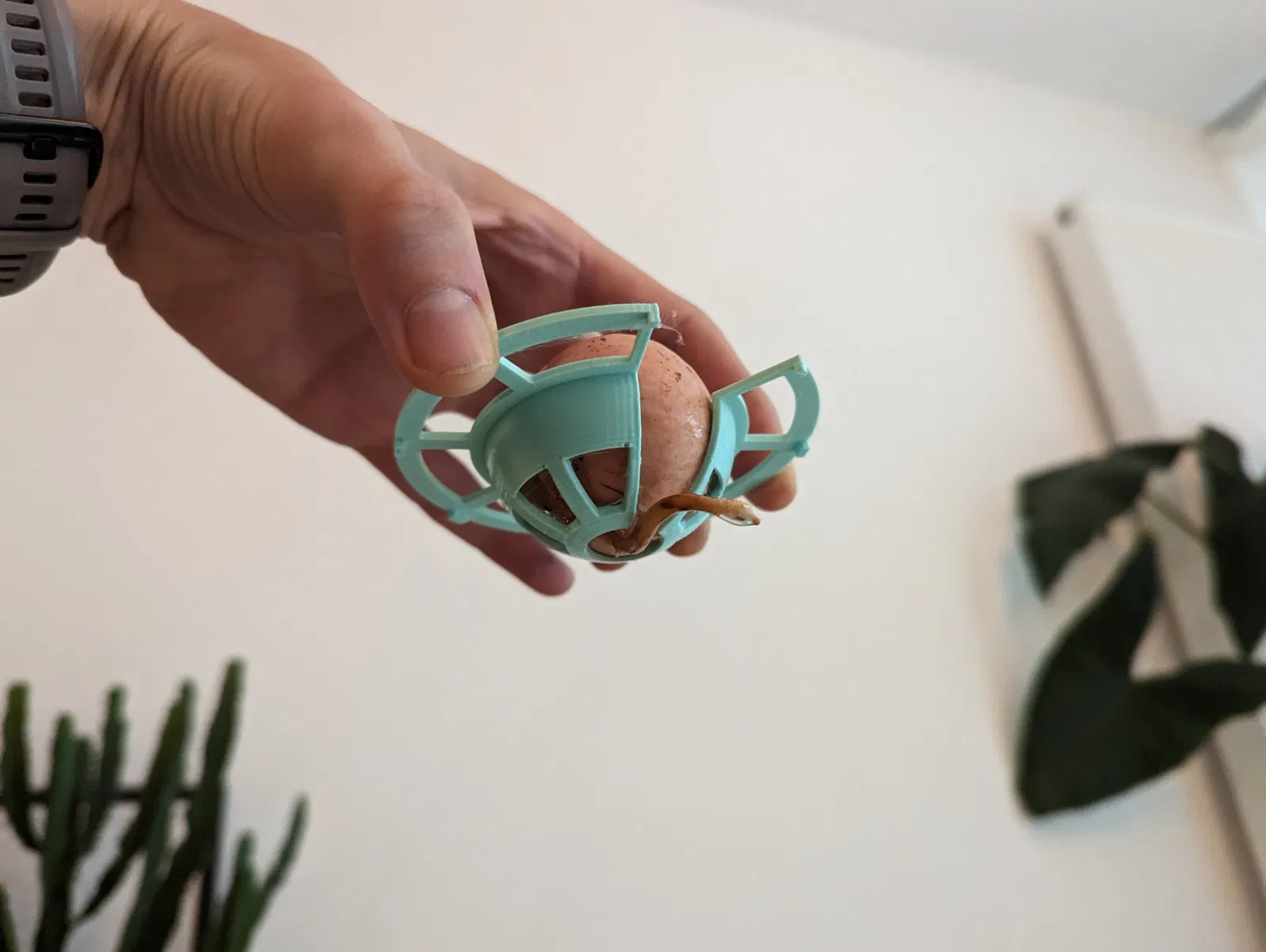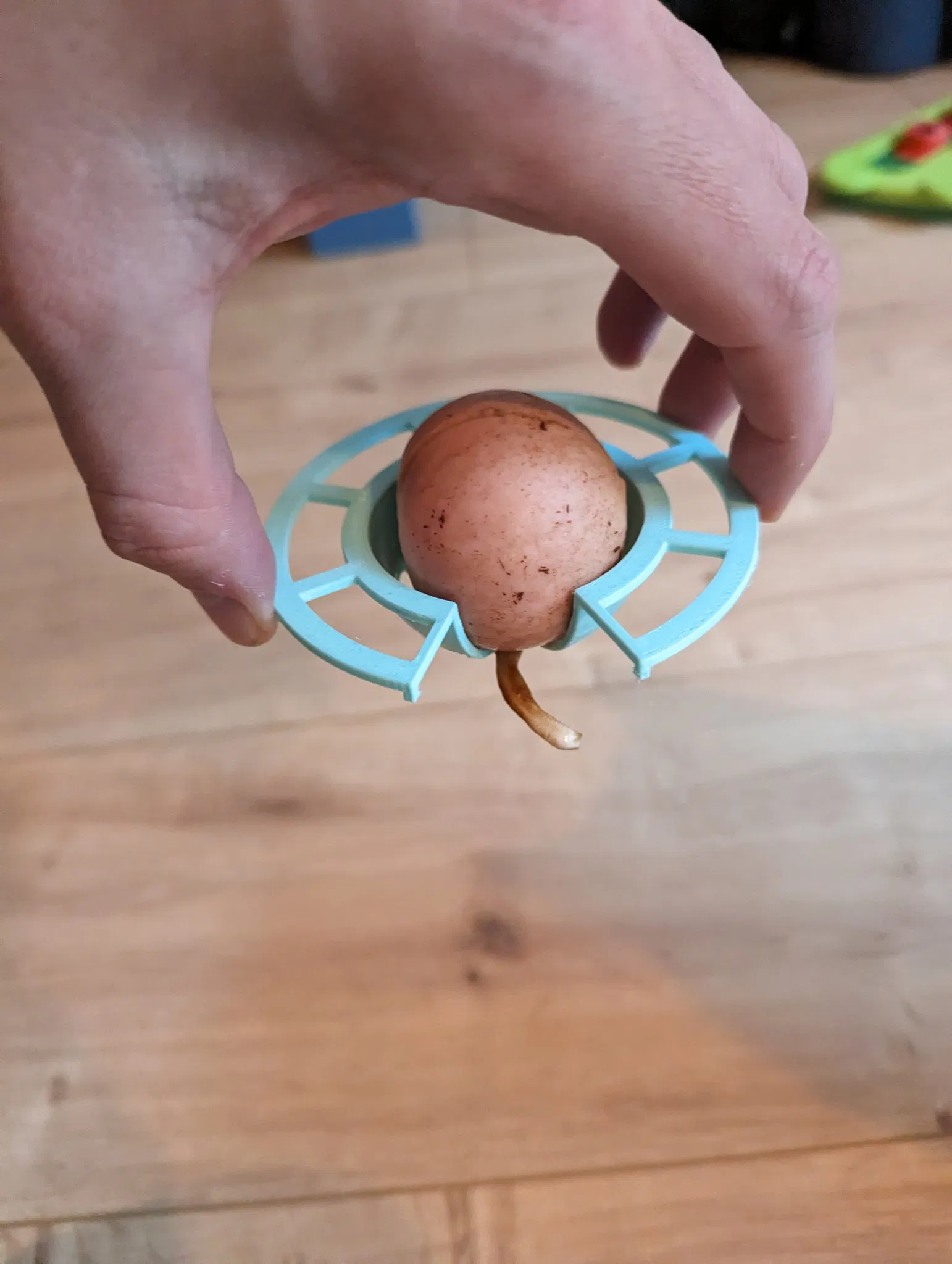 Tệp để in một giá đỡ hạt bơ. Nó có bán kính tổng cộng là 9 cm (3,54 inch) và phù hợp với các lọ có bán kính cạnh ngoài là 8,5 cm (3,34 inch). Giá đỡ hạt là một nửa hình cầu, phù hợp với các hạt có bán kính lên đến 5 cm. Nửa hình cầu này cho phép hạt được ngâm trong nước lên đến 50%. Giá đỡ có một lỗ cắt để dễ dàng tháo lắp và chèn hạt + rễ.