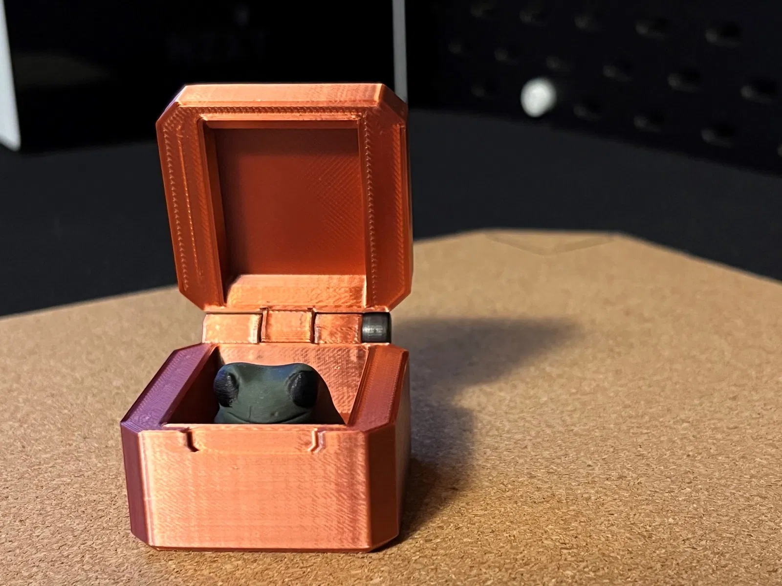 Bạn gái tôi rất thích ếch, nhưng mọi con ếch tôi làm cho cô ấy đều bị hỏng nên tôi quyết định làm một cái hộp dễ thương cho Fred, mà cô ấy rất thích. Vừa vặn với “Fredresculptured” mà Fred đã tải lên bởi Xen <https://www.f3d.vn/3d-model/17569-ech-fred-de-thuong-danh-cho-in-3d In bằng đồng lụa pla từ eryone, độ cao lớp 0.16mm. Sử dụng một bu lông M5 30mm làm bản lề và nam châm nhúng, cho cái này bạn cần đặt một khoảng dừng trong slicer của bạn (vừa vặn với những nam châm 5x3mm này từ aliexpress) https://vi.aliexpress.com/item/1005005243638778.html?spm=a2g0o.detail.1000023.15.1d4664bdBeFWXQ&gatewayAdapt=glo2vnm)) Bạn phải tự làm mịn nắp và đáy trong slicer của bạn. Đã thêm tệp STEP để bạn có thể điều chỉnh kích thước của nam châm hoặc bu lông của bạn.