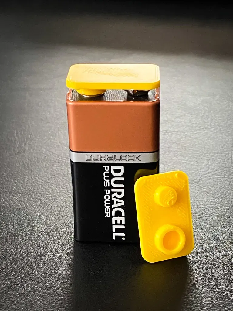 Nắp đơn giản cho pin 9V PP3 để ngăn các tiếp điểm bị chập trong quá trình lưu trữ.