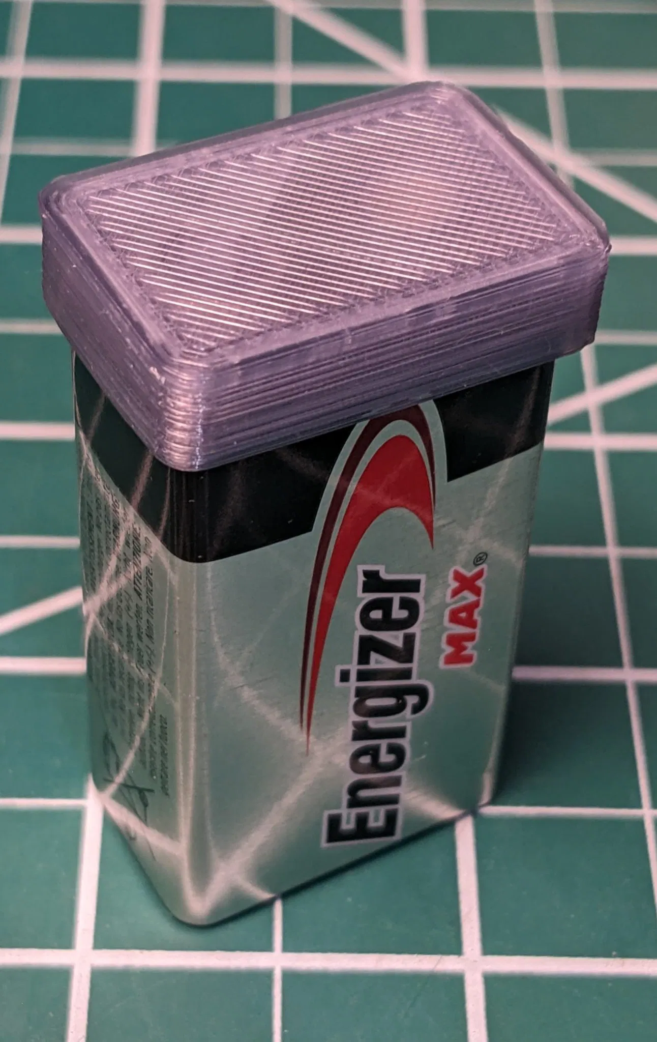 Đây là phiên bản của tôi về nắp pin 9V. Kích thước và hình dạng thô được điều chỉnh từ mô hình của muxbux, nhưng hầu hết các kích thước và sự căn chỉnh đã được thay đổi để phù hợp với máy in và các viên pin của tôi.