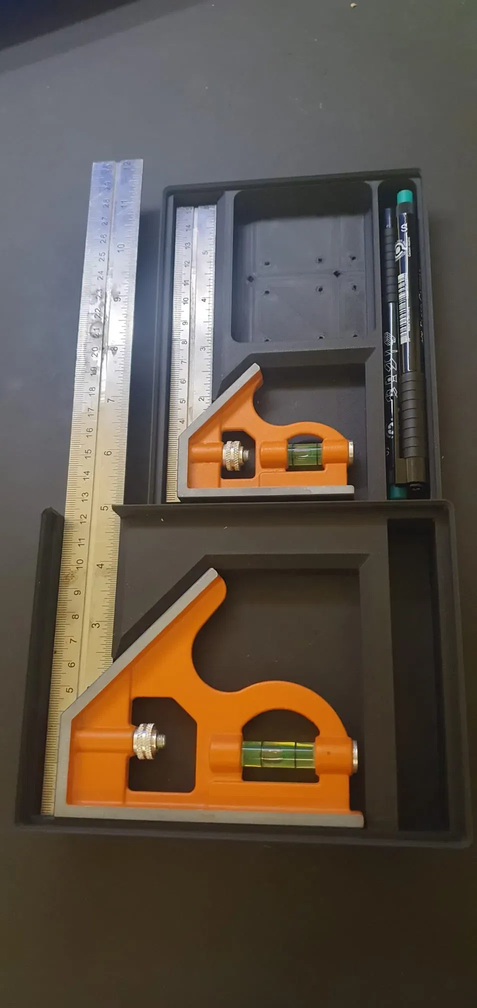 Đây là một thiết kế Gridfinity để lưu trữ góc đo nhỏ (150) và lớn (305) từ công ty Bahco.