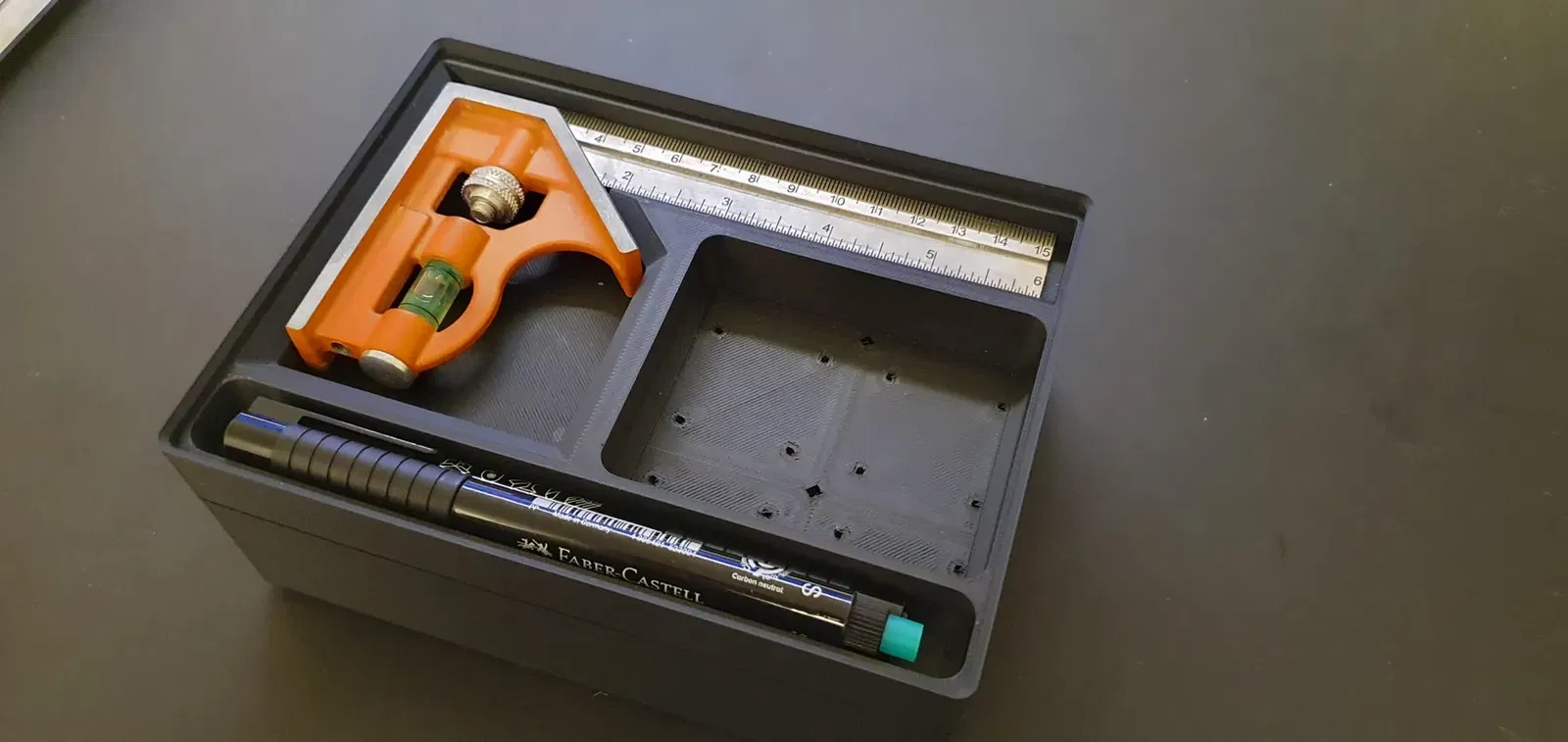 Thiết kế cho kích thước lớn 305 vuông có thể xếp chồng lên nhau và có chiều cao đầy đủ của nền tảng gridfinity (6). Bộ tổ chức nhỏ không đủ sâu hơn vài milimét, vì vậy nó không thể xếp chồng. Cả hai thiết kế đều chứa một số không gian lưu trữ bổ sung, ví dụ, một cây bút.