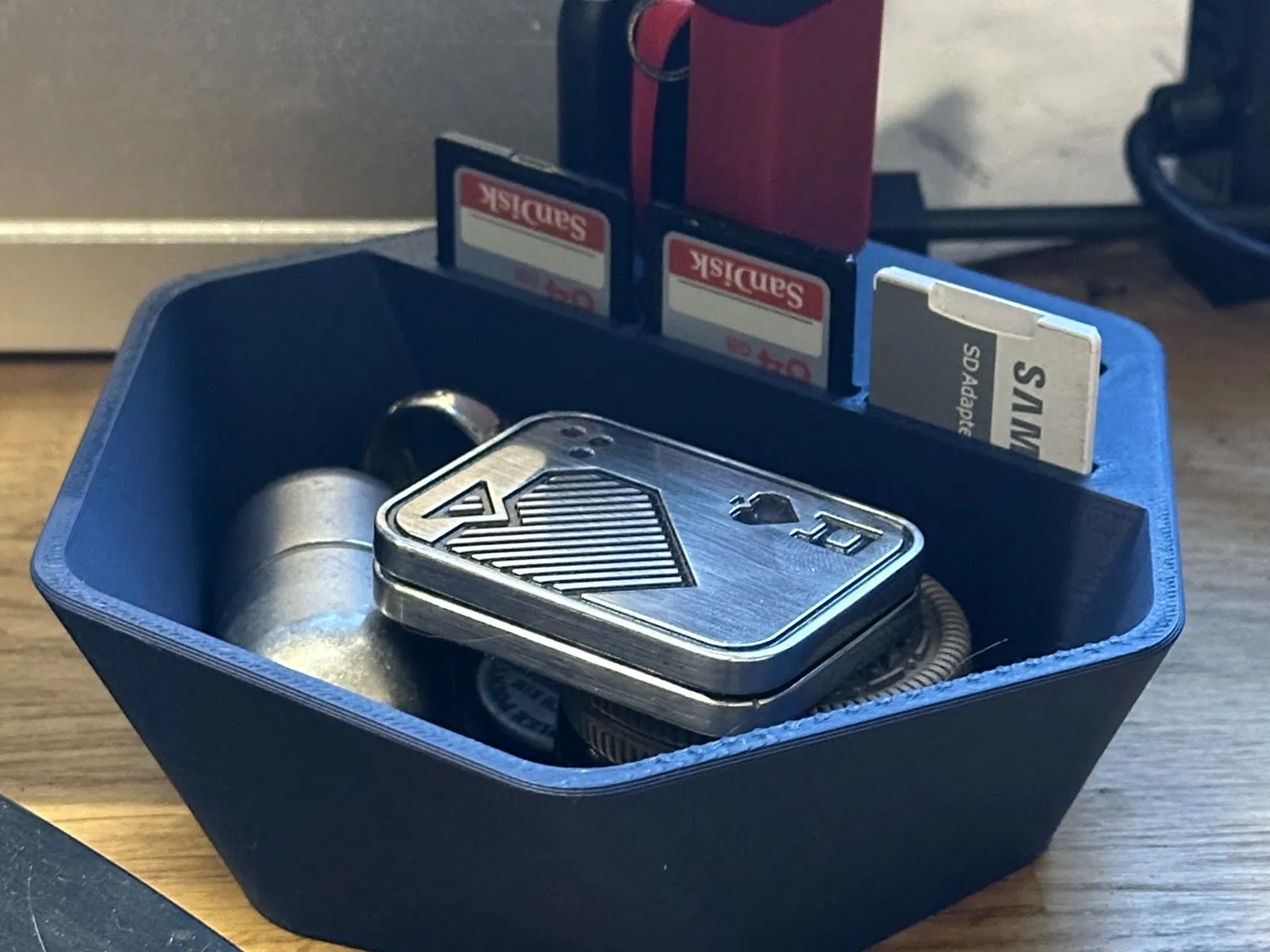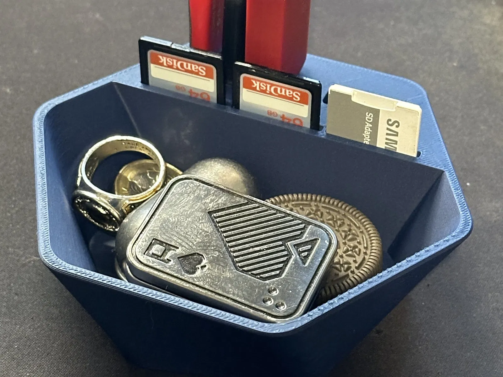 bát để bàn nhỏ được thiết kế để lưu trữ một vài ổ USB hoặc dongle cũng như một số thẻ SD. Tôi đã thêm cả USB A và C cũng như một khu vực bát ở phía trước để chúng tôi có thể đặt những đồ vật lặt vặt mà chỉ lăn lóc trên bàn của chúng tôi.