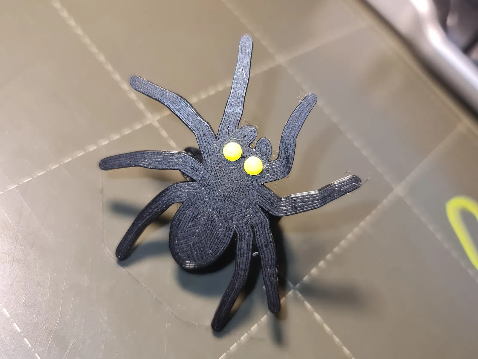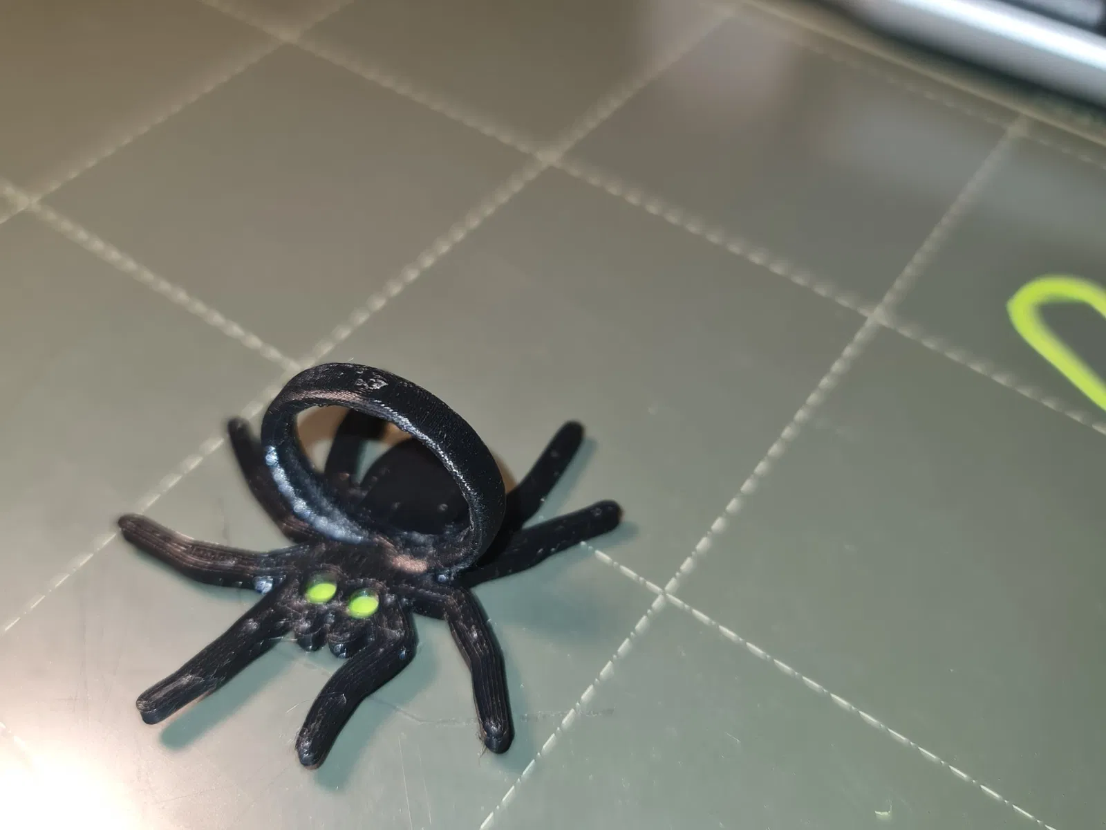 Chiếc nhẫn nhện này tôi đã in trên tấm kim loại có cấu trúc. Đôi mắt ở trên bề mặt nhẵn. Tôi đã để một viền xung quanh đôi mắt để tăng độ bám. Sau khi in, viền này có thể được gỡ bỏ và đôi mắt có thể được ấn vào con nhện. Không cần keo dán. Chúng ngồi chắc chắn ở đó. (Chỉ có điều hơi khó làm việc với những phần nhỏ như vậy)