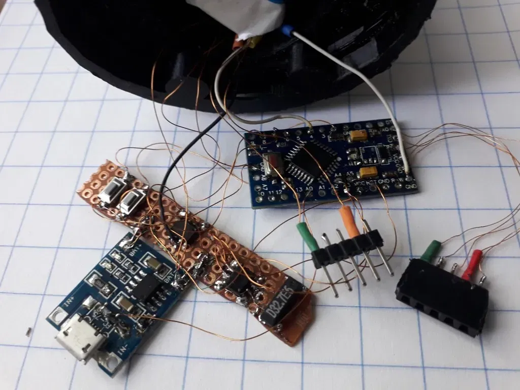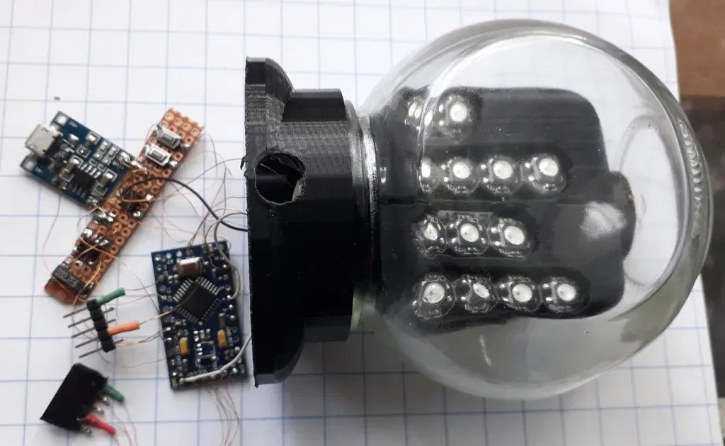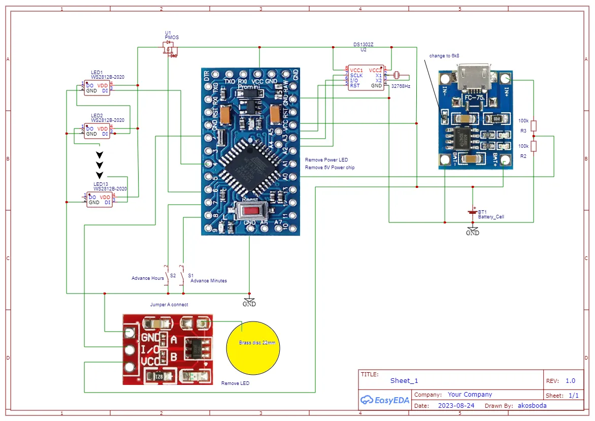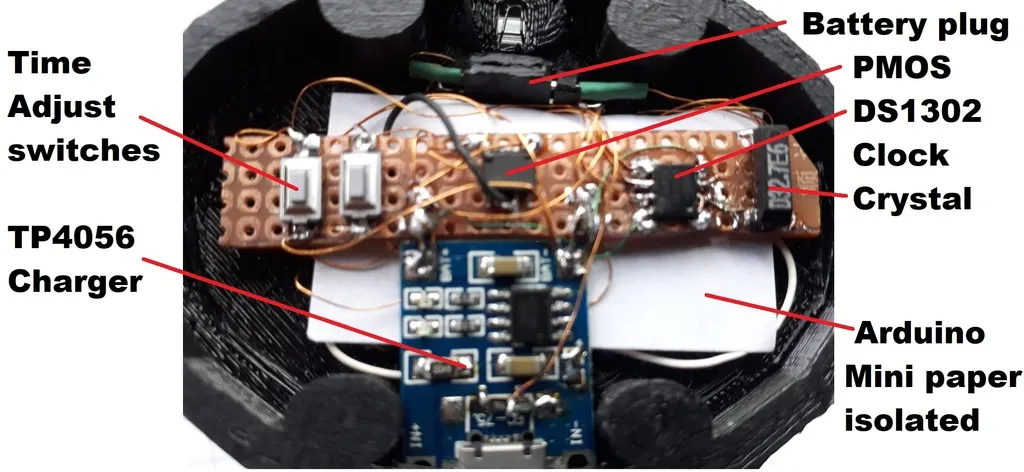 cho 1, vàng cho 2, xanh lá cho 4, xanh dương cho 8 trọng số nhị phân. Để đọc thời gian, bạn cộng các trọng số theo chiều dọc. Khi bộ sạc được kết nối, màn hình luôn sáng. Chuẩn bị: Hàn 4-4-3-2 mảnh PCB WS2812B lại với nhau, tất cả Vcc và Gnd song song, DO đến DI tiếp theo. Chuỗi 13 LED như sau: phút 1-2-4-8-10-20-40 đến giờ 1-2-4-8-10-20 tất cả nối tiếp. TTP223: Cắt một tấm đồng hoặc kim loại khác có đường kính 22mm và hàn nó bằng một dây rất ngắn vào chân 3 của chip TTP223. Điều này tăng độ nhạy. Làm cầu nối A (đầu ra thấp hoạt động). Gỡ bỏ LED hoặc điện trở của nó. TP4056: Gỡ bỏ/thay thế điện trở 1k2 bằng 6k8. Hàn 2 điện trở 100k giống nhau vào đầu vào USB + bên GND tạo thành bộ chia điện áp 1/2 cho Arduino A0. Arduino Mini: Gỡ bỏ LED nguồn hoặc điện trở của nó. Gỡ bỏ chip LDO 5V không sử dụng để tránh rò rỉ điện. Xây dựng: In các bộ phận 3D. Giá đỡ màn hình có thể gập lại xung quanh ống pin 18650 và chỉ có thể đi qua cổ chai khi gập lại. Chèn (dán) các đèn LED WS2812B có dây, ở trên cùng là TTP223 có dây và gập hai nửa lại với nhau để chèn vào trong kính. Khi ở bên trong, mở ra đến chiều rộng tối đa và gắn vào đáy in 3D bằng 2 vít. Sử dụng ngón tay của bạn trong ống pin để định vị màn hình, để làm cho bước này dễ dàng hơn. Cần một chút kiên nhẫn. Kết nối phần còn lại, tải chương trình, chèn pin vào ống, kiểm tra mức sạc pin. Bạn có thể dán (keo epoxy) bảng mạch sạc vào vị trí khi đã sẵn sàng và hoạt động. Giữ ngón tay của bạn trên kính giữ cho màn hình sáng, từ từ tăng cường độ lên tối đa. Điều chỉnh thời gian: không có bộ sạc, giữ và nhấn công tắc điều chỉnh, chạm vào kính để bật màn hình, thời gian sẽ tiến bộ miễn là bạn giữ nút. Bình kính có đường kính 80mm với miệng mở 40mm. Vì lý do nào đó, xuất tệp PDF từ Easy Eda có lỗi, hình ảnh Arduino bị lệch. Xem jpg giống nhau. Cập nhật 19 tháng 10 năm 2023: Một số chip WS2812B yêu cầu một khoảng thời gian trễ sau khi bật nguồn, vì vậy vui lòng thêm sau mỗi digitalWrite(6, 0); delay(10);
