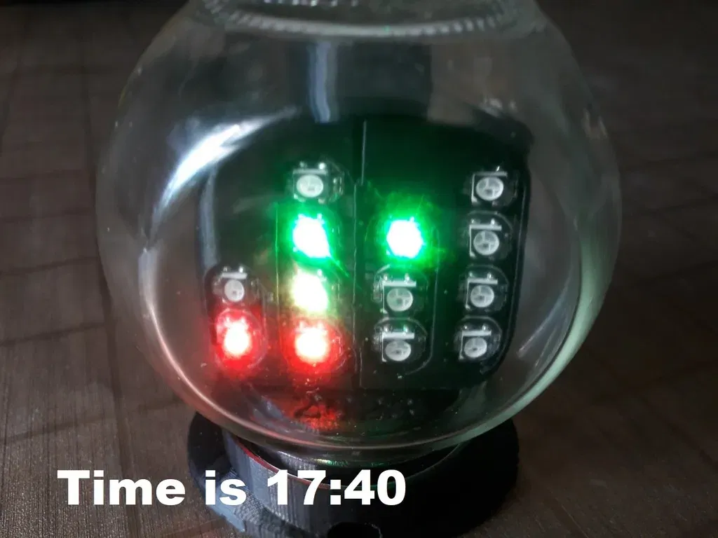 Đồng hồ nhị phân được xây dựng trong một container bằng kính Pepco/Poundland SKU 34705101. Nó có 13 đèn LED WS2812B để hiển thị thời gian mã nhị phân. Khi chạm vào mặt kính, Arduino nhận được một ngắt đánh thức từ cảm biến chạm TTP223, thức dậy từ chế độ ngủ, đọc chip giữ thời gian DS1302 và hiển thị thời gian trên chuỗi LED WS2812. Chờ 2 giây, tắt nguồn WS2812, quay trở lại chế độ ngủ để tiết kiệm pin. Trong chế độ này, mức tiêu thụ khoảng 30 uA, có nghĩa là pin có thể hoạt động khoảng