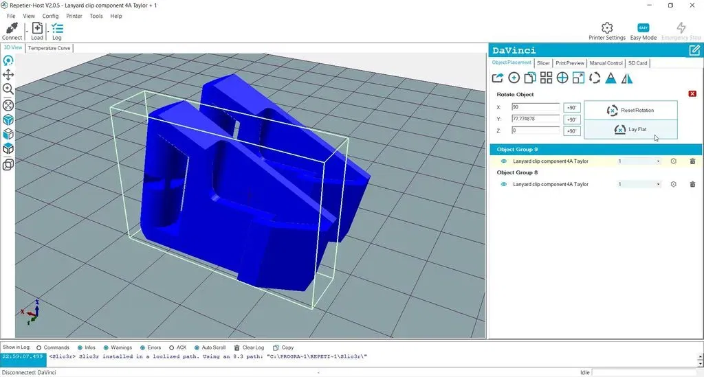 Tệp gốc đã được đổi tên thành Lanyard-clip-original_MatthewGTaylor.STL và xoay về hướng tốt nhất để in.