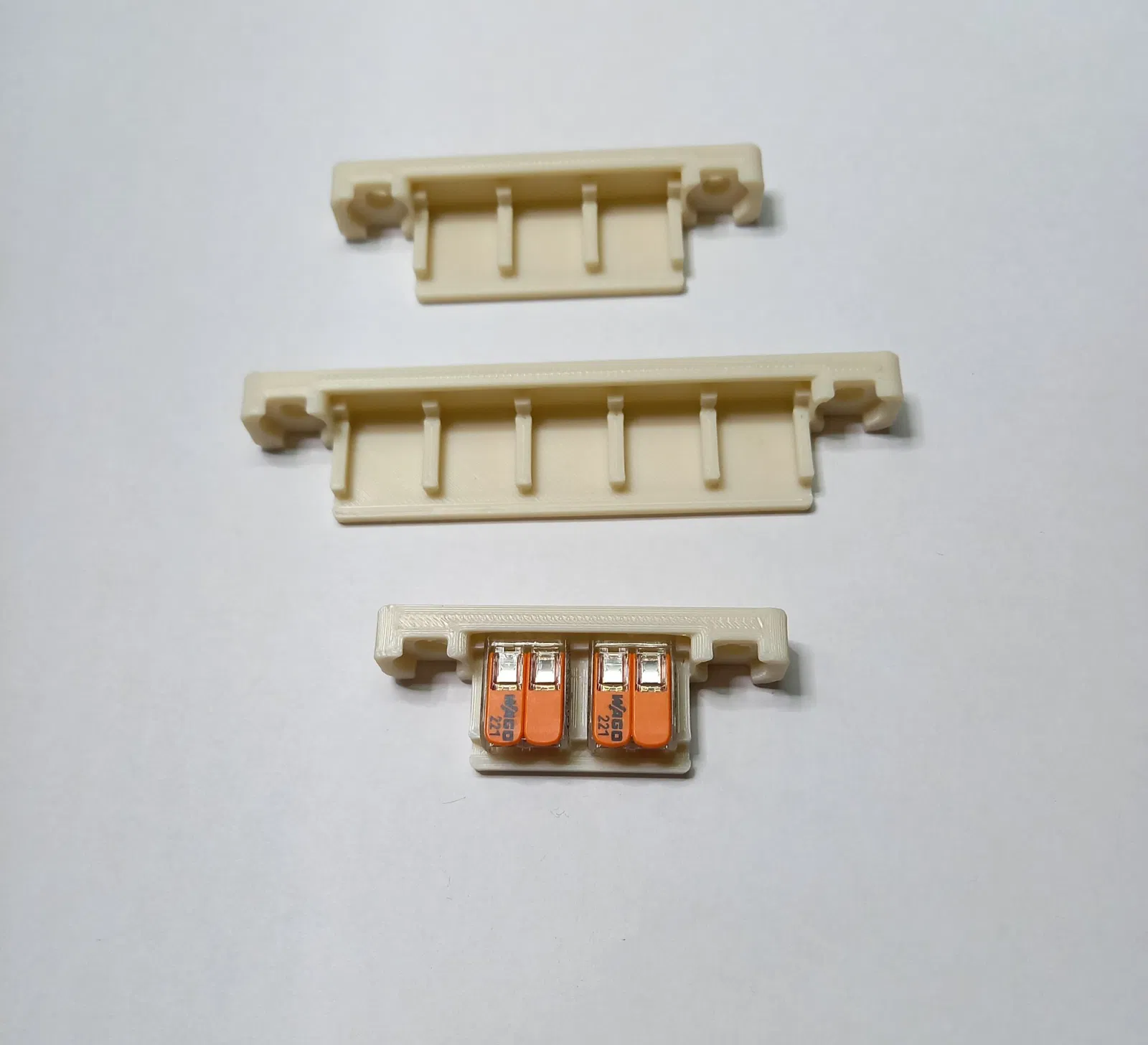 Tôi đã tách giá đỡ WAGO khỏi lắp ráp VORON Trident trong CAD, để các đoạn có thể được thêm hoặc gỡ bỏ theo ý muốn. Tôi cần giá đỡ cho 2x và 5x WAGO 221-412. Tập tin Fusion 360 có sẵn để chỉnh sửa theo nhu cầu của bạn. Di chuyển các đoạn 15,5 mm để căn chỉnh chúng một cách hoàn hảo.