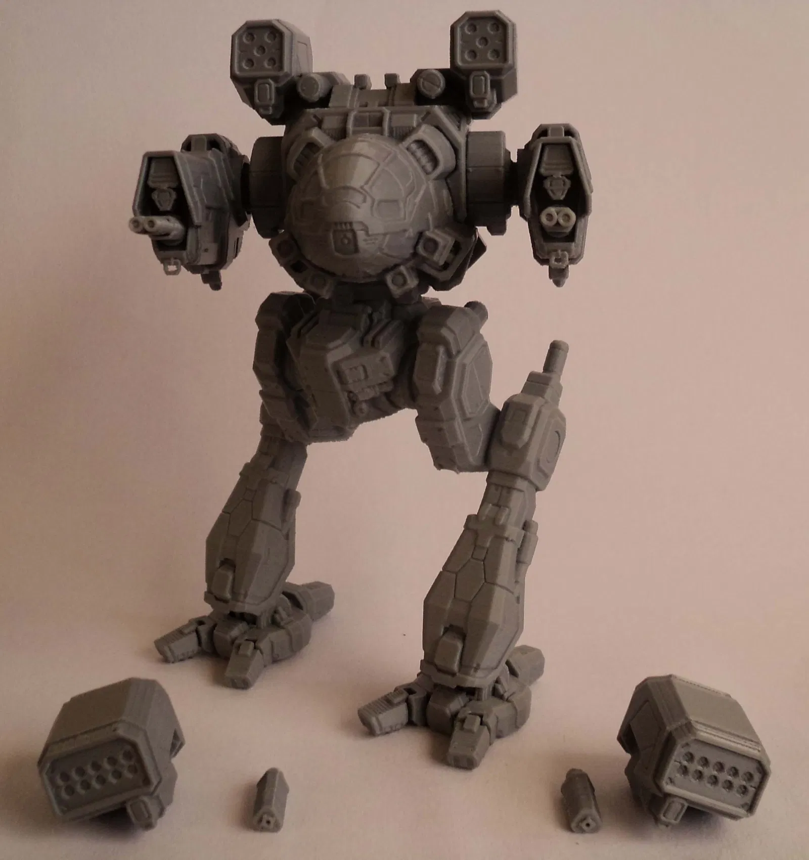 Hoàn toàn có thể khớp, và đã được kiểm tra, tất cả các bộ phận nên hoàn toàn thân thiện với máy in và không có lỗi. Với nhiều tùy chọn thân và vũ khí (nhiều hơn bất kỳ phiên bản trước nào), và giống như Atlas, không cần keo để lắp ráp. Các pod LRM có thể được in riêng và gắn vào một số thân nhất định để tạo ra nhiều tùy chọn hơn cả 12 tùy chọn mà tôi đã cung cấp, và tôi đã thêm một số gắn vũ khí nữa cũng như làm lại một vài cái. Biến điều này thành 'Mech có thể tùy biến nhiều nhất mà tôi đã làm đến thời điểm này.