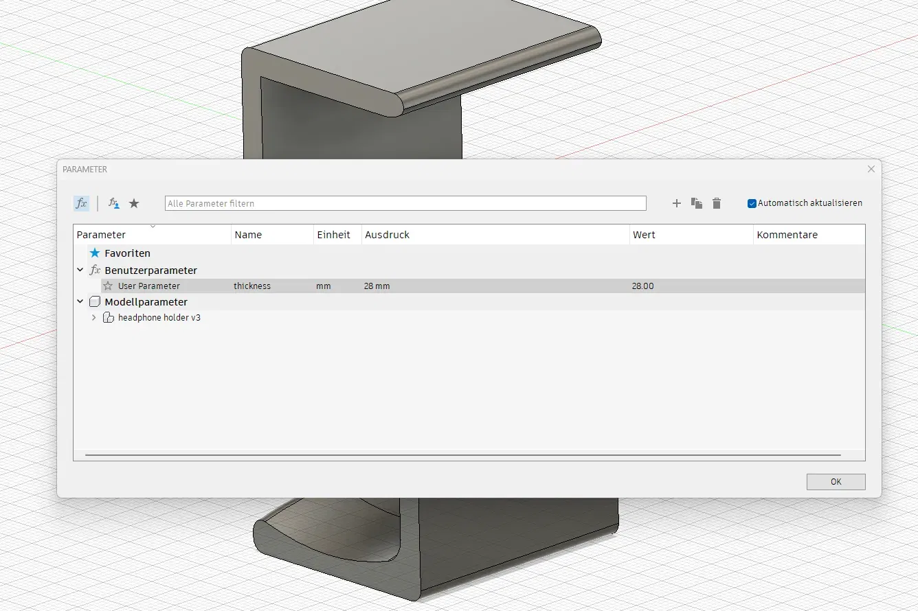 Tệp stl bao gồm được thiết kế cho một bàn dày 28 mm như bàn Idasen hoặc Lagkapten của Ikea. Để điều chỉnh mô hình cho bàn của bạn, bạn sẽ cần thay đổi tham số ‘độ dày’ trong Fusion 360. Để làm điều đó, hãy mở tệp .f3d và điều hướng đến tab ‘sửa đổi’. Bây giờ mở menu thả xuống và nhấp vào ‘thay đổi tham số’. Một cửa sổ mới sẽ mở ra với tham số ‘độ dày’ ở giữa. Bây giờ bạn có thể nhập độ dày của bàn của bạn tính bằng mm và mô hình sẽ tự động cập nhật tương ứng.
