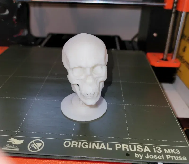 Tôi đã in cả 3 phần cùng một lúc bằng cách sử dụng PLA thông dụng và đã chọn tùy chọn “hỗ trợ chỉ trên bệ xây dựng”. Không cần dùng đến giàn. Hỗ trợ đã được gỡ bỏ dễ dàng từ phần bên trong của hộp sọ bằng cách sử dụng một cái kìm mũi nhọn nhỏ.