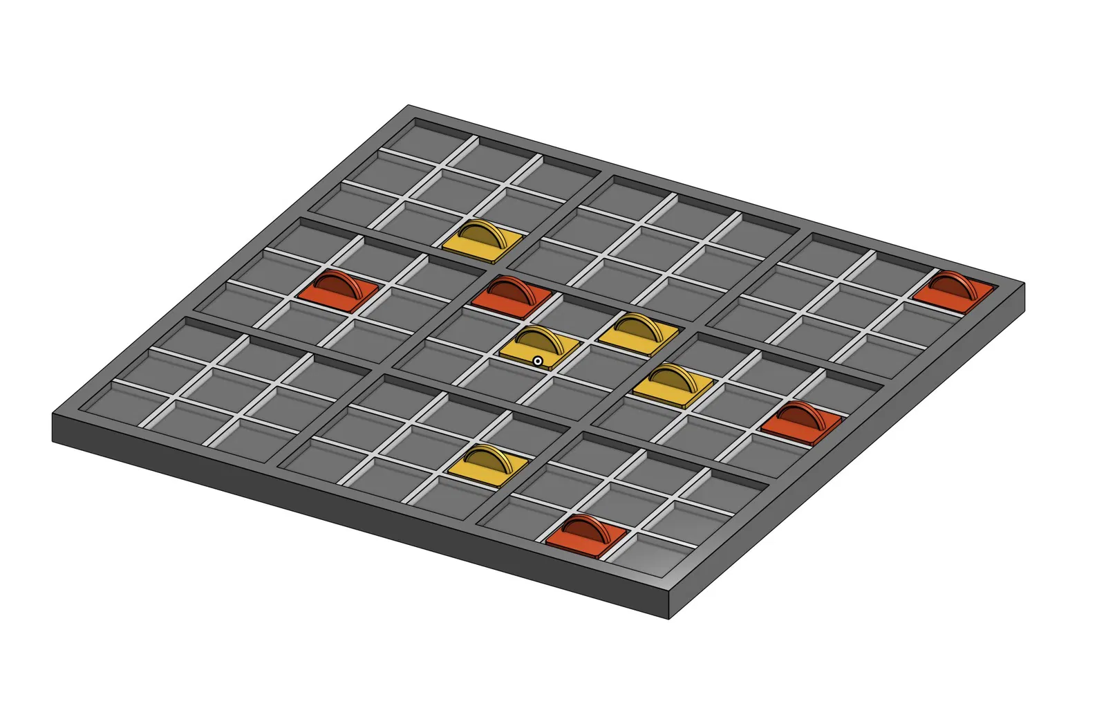 Đây là sự xoay chuyển! Người chơi 1 sẽ đặt viên gạch đầu tiên của họ vào bất kỳ ô nào trong trò chơi Phụ ở giữa. Người chơi 2 sẽ phải chơi trong trò chơi phụ liên quan đến nước đi mở đầu của Người chơi 2. Ví dụ, nếu Người chơi 1 đặt viên gạch của họ ở góc trên bên phải của trò chơi Phụ ở giữa, người chơi 2 sẽ phải đặt viên gạch của họ ở góc trên bên phải của trò chơi Chính. Người chơi 2 sau đó sẽ đặt viên gạch của họ theo ý muốn ở bất kỳ đâu trong trò chơi phụ ở góc trên bên phải, và người chơi 1 sẽ phải chơi theo trò chơi Phụ đó trong trò chơi Chính.
