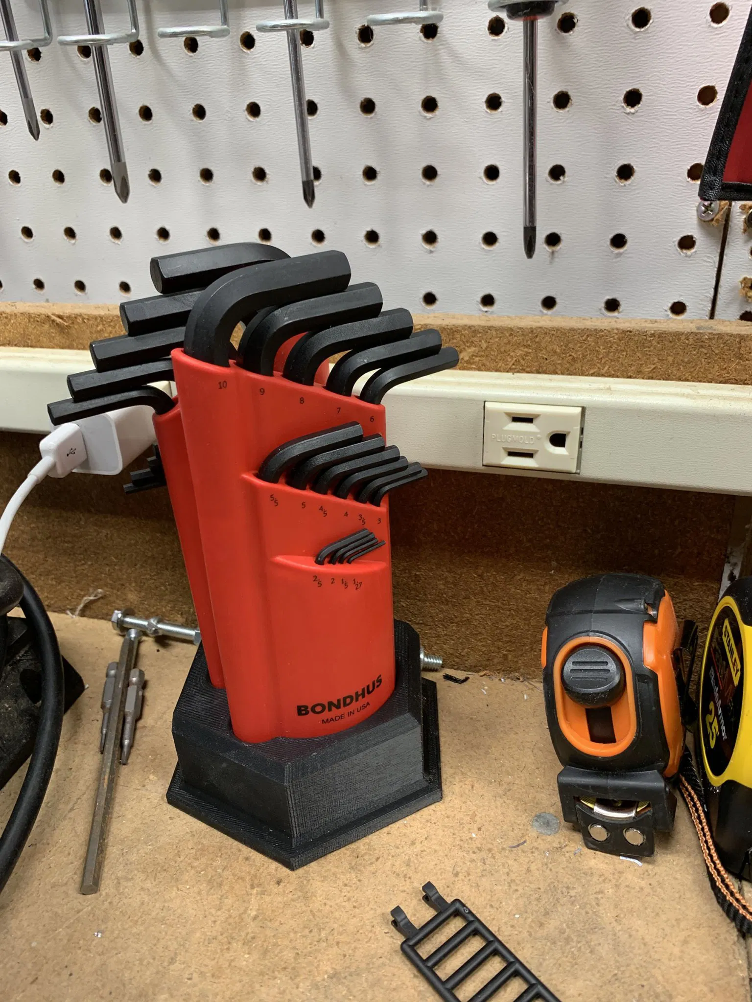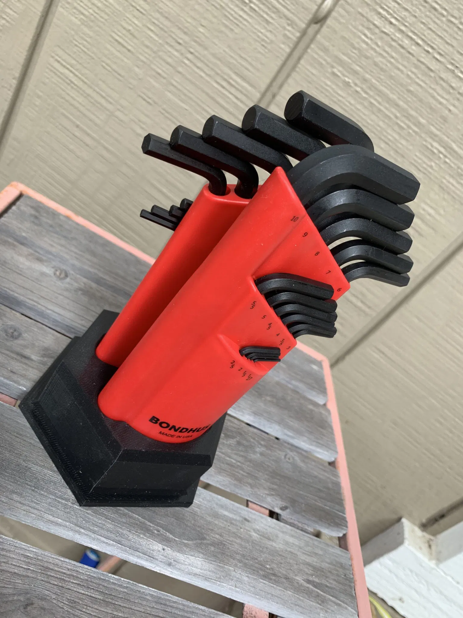 Đây là một đế hình lục giác để giữ các chìa khóa Allen Bondhus theo hệ mét. Bên giữ các chìa khóa đầu vuông có cạnh vuông, và bên giữ các chìa khóa đầu bóng có một đường cong lớn, vì vậy dễ dàng nhận biết cái nào là cái nào. Thật không may, các bộ chìa khóa SAE (màu vàng) có hình dạng khác với những cái theo hệ mét này.