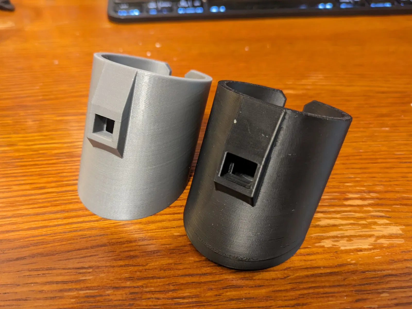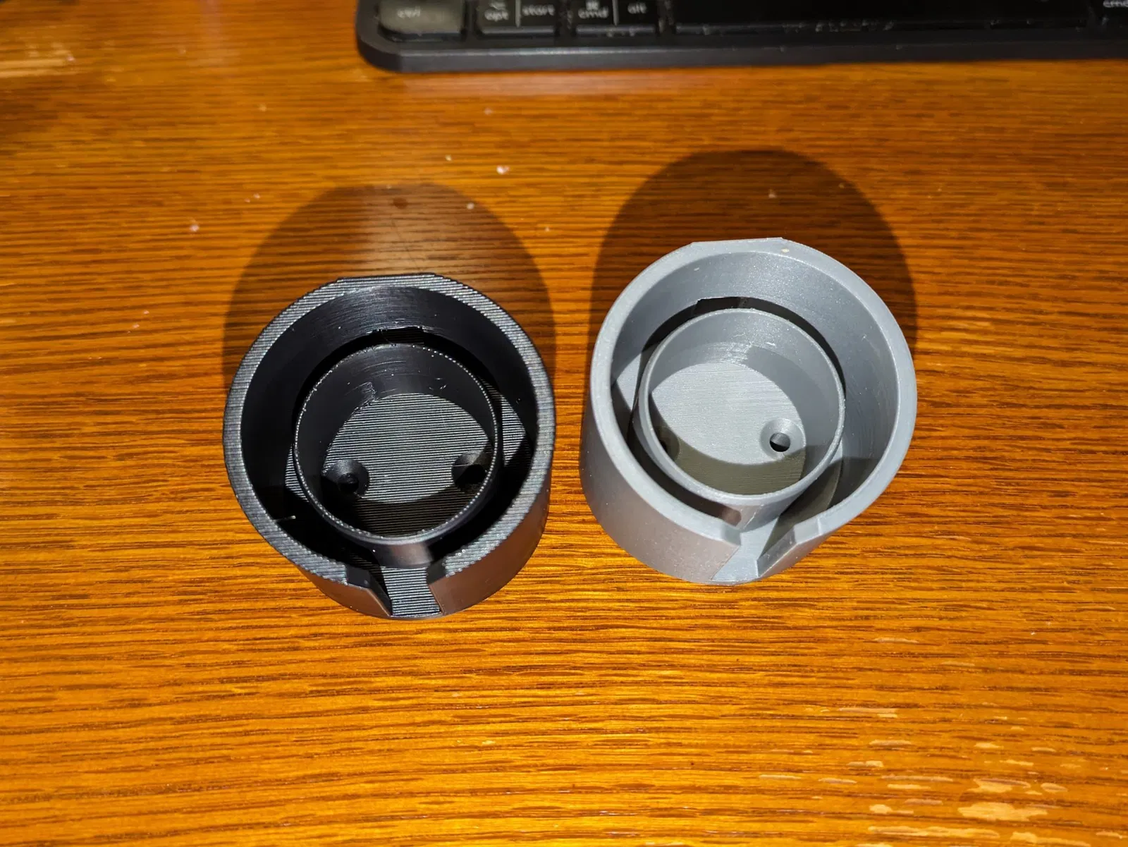 Bức ảnh của hai cái này cho thấy mô hình gốc từ hag, in bằng PLA màu xám, bên cạnh thiết kế đã chỉnh sửa của tôi in bằng ASA màu đen. (Bỏ qua việc biến dạng trên bản in ASA - tôi vẫn đang cố gắng điều chỉnh cho đúng).