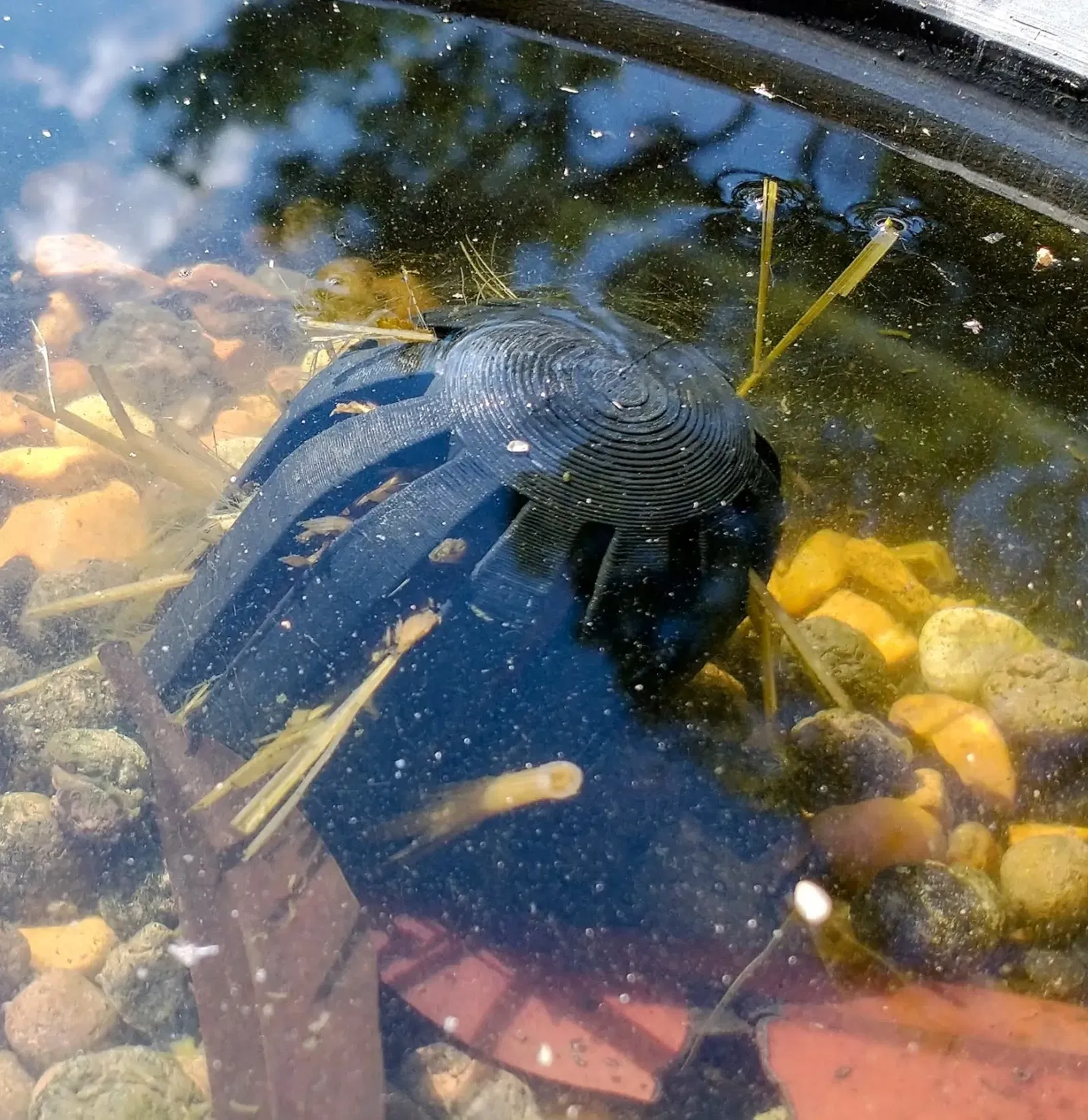 Mục đích ban đầu là để tạo ra một thiết bị mà bạn nhồi đầy rơm đại mạch và cho phép nó phân hủy mà không trôi nổi khắp nơi. Vít vào nền hồ để ngăn nó trôi đi. Dễ sử dụng, chỉ cần nhồi rơm vào đó và vặn vào nền hồ. Thiết bị hoạt động, nhưng không thể nói về việc kiểm soát tảo....