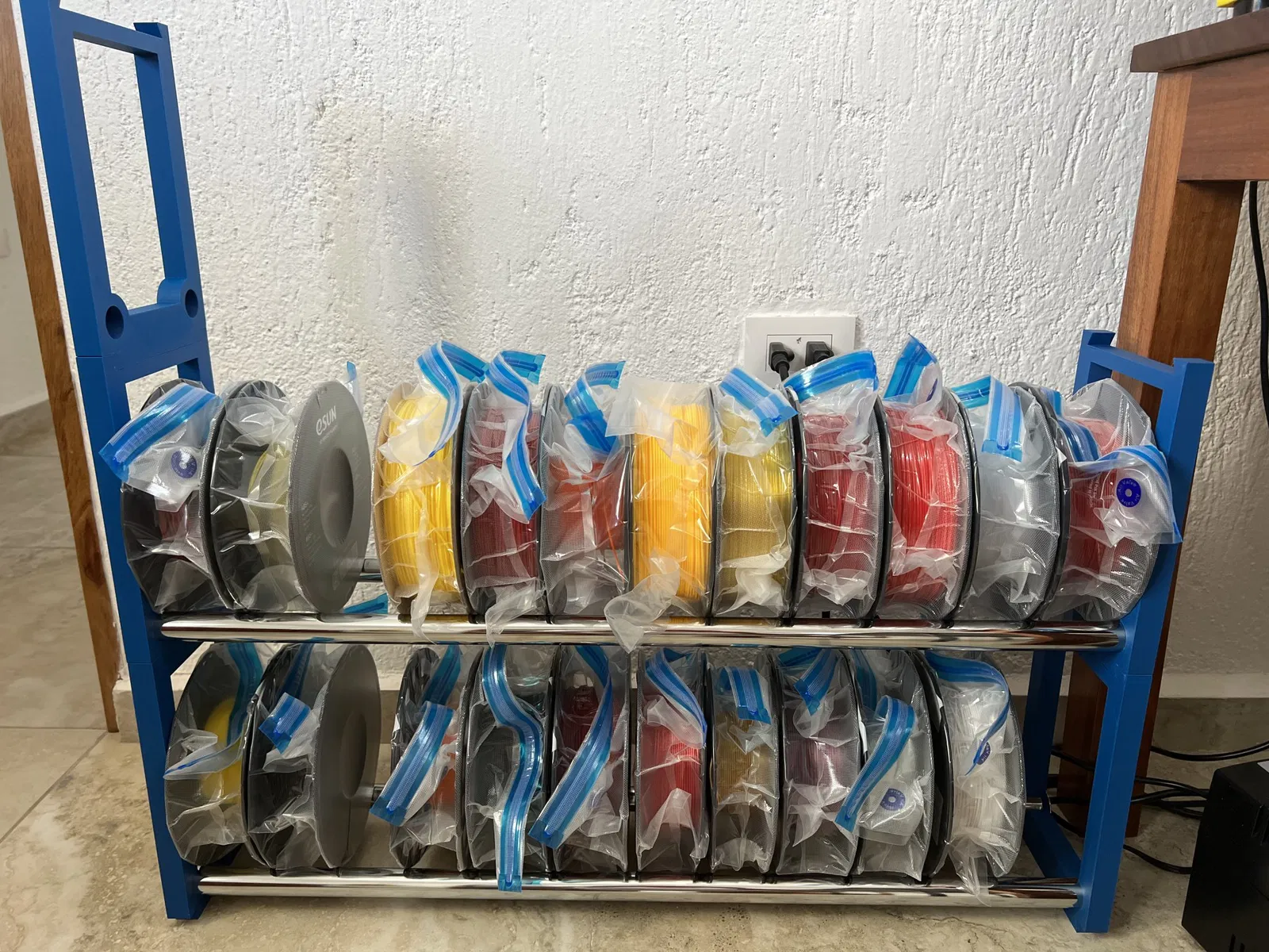 Tôi muốn một cái gì đó mà tôi có thể mở rộng khi tôi thêm nhiều cuộn filament hơn. Tôi sử dụng cái này với một thanh tắm chrome 1", cắt thành 32", và bên trong là một cây gỗ ¾" cắt cùng chiều dài. Tôi sử dụng các lỗ ở đầu giá để đặt một cái vít #8x3/4" với một đĩa rửa Fender vào đầu của cây gỗ. Điều này nhằm mang lại cho đơn vị một chút ổn định bên. Hiện tại tôi đang xếp chồng 2 cái cao mà không gặp vấn đề gì và đang chuẩn bị thêm một tầng thứ ba. Đây là thiết kế chóp mộng với một sự vừa vặn rất chặt, vì vậy không cần các loại bu lông từ khung này sang khung khác.