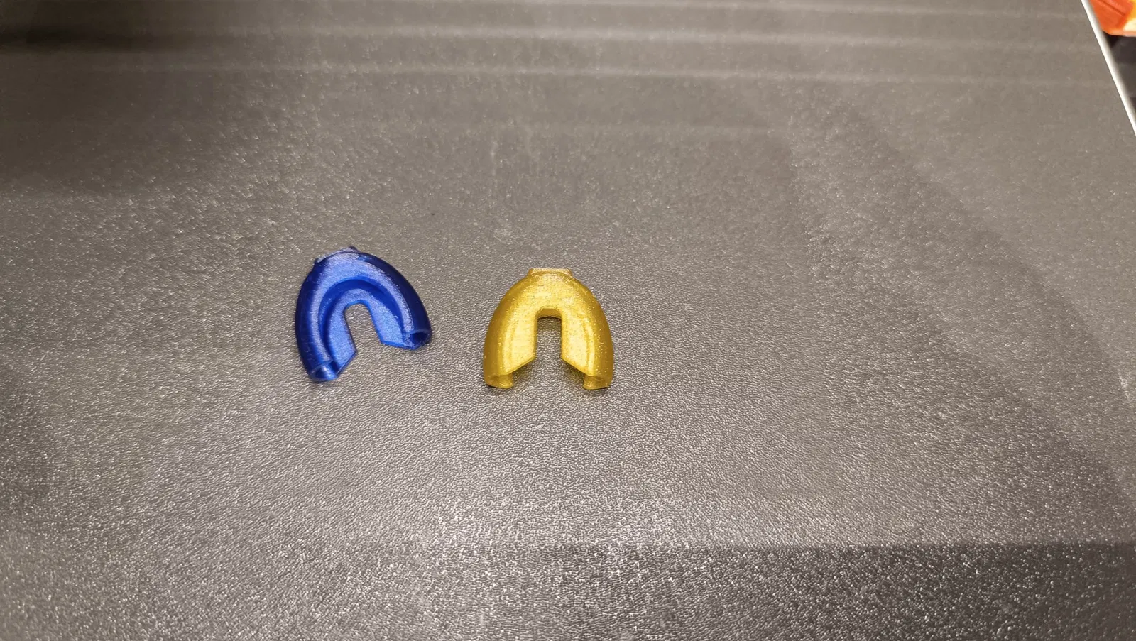 Tôi sử dụng cả giá đỡ cuộn dây góc thấp và kẹp filament K2 cùng nhau. Tôi nhận thấy rằng có thể trong quá trình in, kẹp K2 bị kẹt vào vòng dẫn filament của giá đỡ cuộn dây, xem ảnh thứ 2 (tái tạo tình huống vì tôi quên chụp ảnh khi điều đó xảy ra). Điều này khiến filament bị kẹt một chút khi đầu in di chuyển ra khỏi vòng dẫn filament, nhưng không khi nó di chuyển về phía đó. Hiệu ứng là có hiện tượng thiếu đùn ở một bên của bản in, nhưng không ở bên kia, xem ảnh thứ 3 (thiếu đùn ở bên trái). Để ngăn chặn tình trạng kẹt này, tôi đã thiết kế một bộ chuyển đổi có thể đơn giản kẹp vào vòng dẫn filament, xem ảnh thứ 4. Phía nửa kín hướng về cuộn filament. Phần trên của bộ chuyển đổi có một chỗ phình ra và khu vực phẳng. Điều này cho phép nó được in ngược mà không cần hỗ trợ. Chỉ cần cẩn thận vì khu vực trên bàn in khá nhỏ. Tệp SCAD tham chiếu đến thư viện af-basics.scad có thể được tìm thấy ở đây: <> Phiên bản từ 2023-10-21 (hoặc mới hơn nếu có) là cần thiết cho mô hình này.