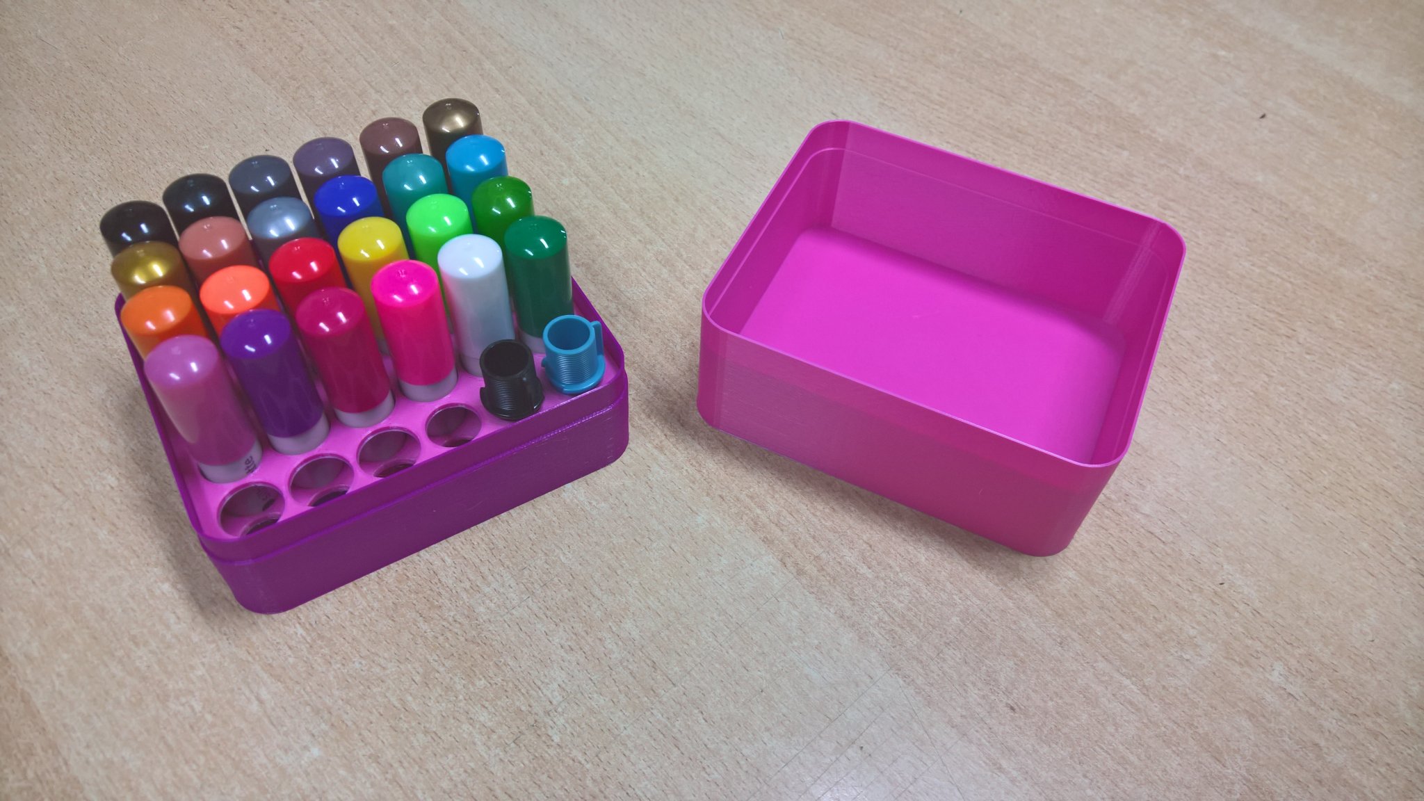 Đây là giá đỡ/hộp cho bút vẽ Silhouette Cameo và dao cắt. Nó sẽ giữ 24 bút màu tiêu chuẩn với ba chỗ cho các bút bổ sung và ba chỗ cho dao cắt.