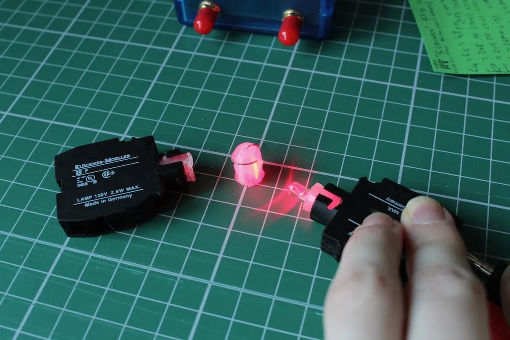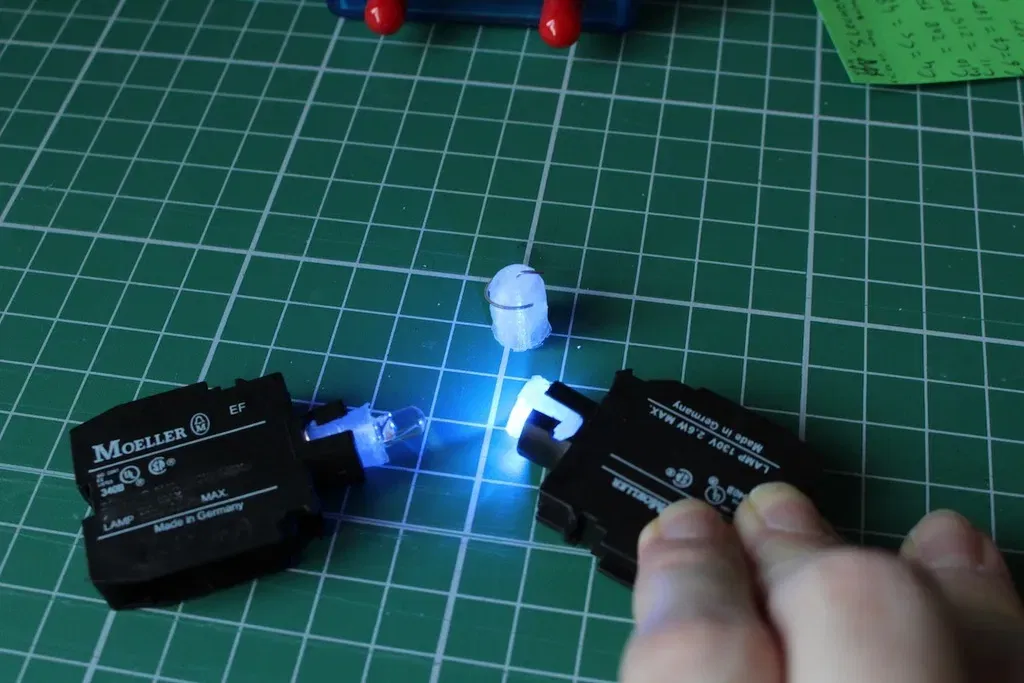 Để phù hợp với đèn LED vào đèn tín hiệu hoặc phụ kiện nút của Moeller EF. LED (cộng với điện trở được hàn vào LED) có thể phù hợp với điều này.