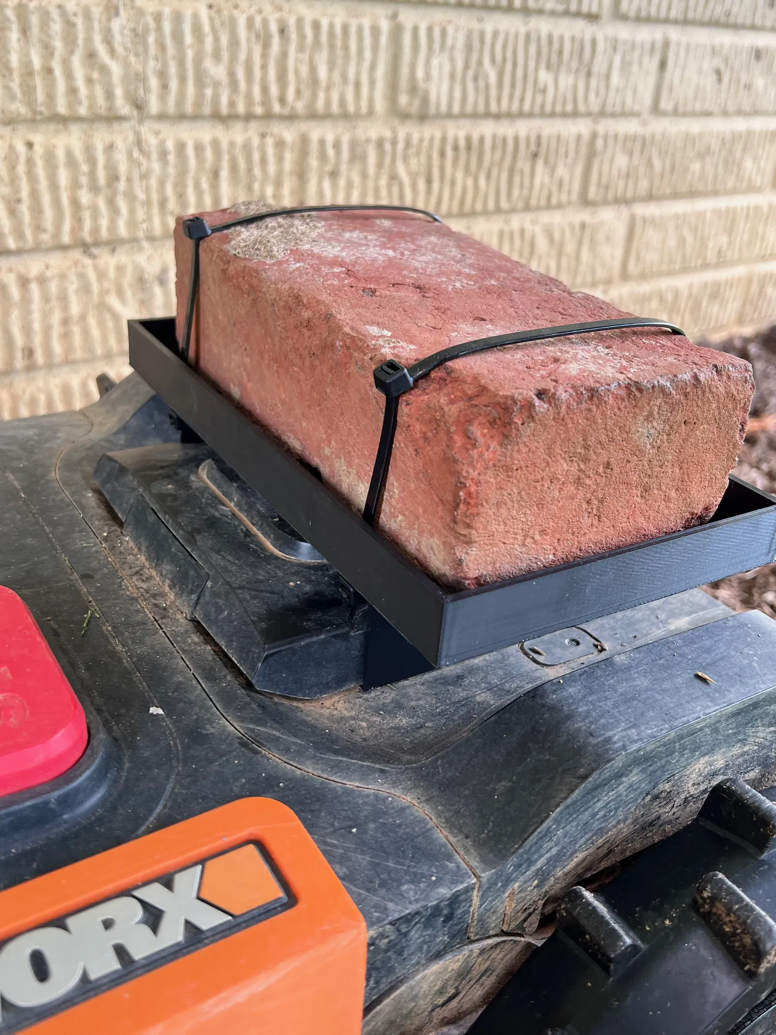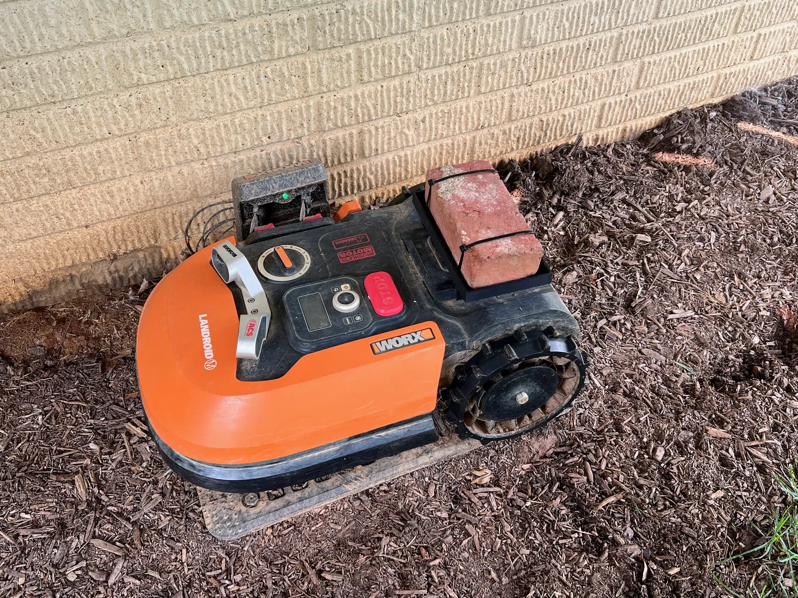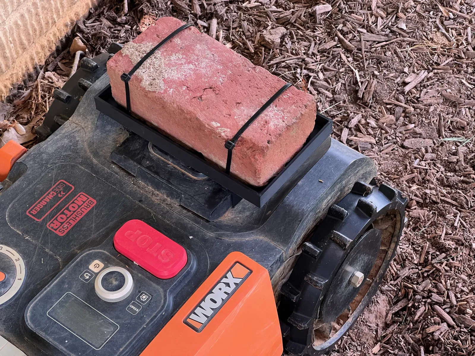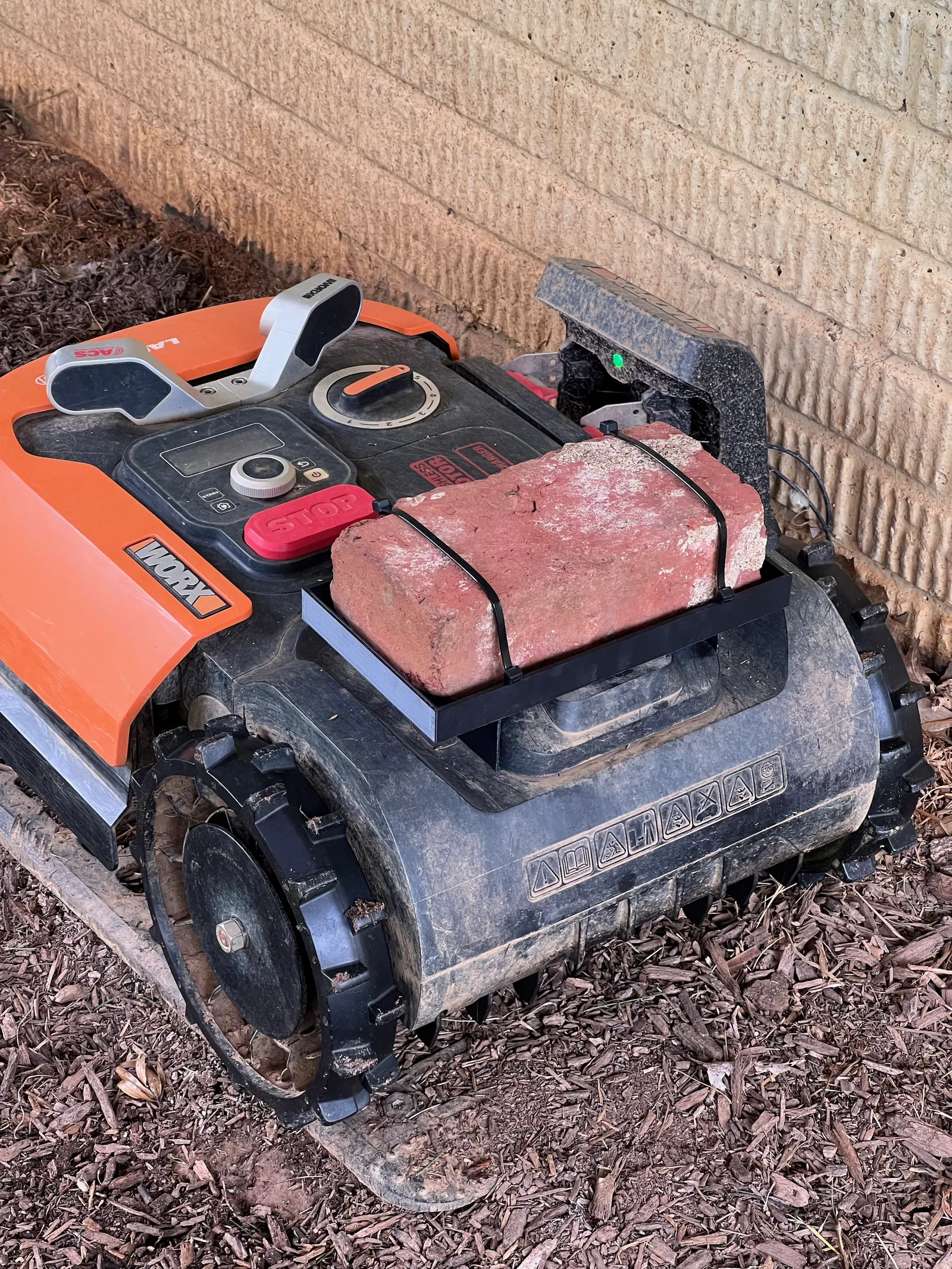Tăng cường độ bám cho Worx Landroid chỉ với một viên gạch. Giải pháp thay thế đơn giản, thân thiện với bãi cỏ, thay cho bánh xe có gai. Cải thiện độ ổn định và giảm thiểu hư hại cho sân cỏ.