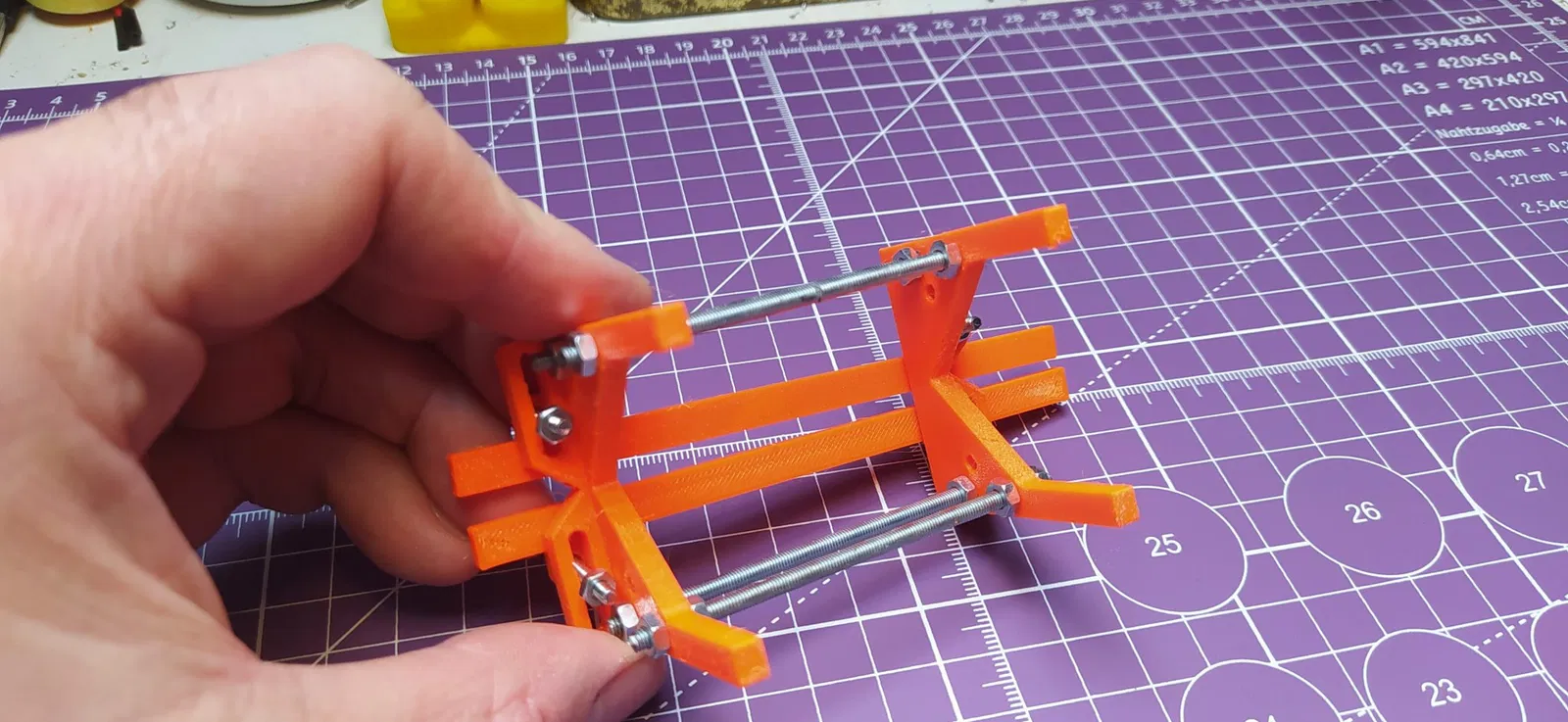 Đây là phiên bản mini của một thiết kế lớn hơn cho jig cánh tên lửa tự căn. Bạn thiết lập jig bằng cách sử dụng một đôi cánh để thiết lập khoảng cách của các thanh, và sau đó bạn có thể gắn ống tên lửa bên dưới trong khe V căn. Nếu điều này hơi khó hình dung, nó hoạt động giống hệt như phiên bản lớn hơn mà tôi bán bộ kit trên Tindie và có một video cho thấy cách thức hoạt động của nó ở đó. Cái nhỏ này hoạt động rất tốt, bạn có thể làm việc với các ống Bt5 hoặc nhỏ hơn lên đến bt50 và hơn nữa với các ống đường kính khoảng 32mm. Bạn sẽ cần một số thanh M3 ngắn dài 75-80mm (bạn có thể mua dài và cắt ngắn) và một số đai ốc M3 cùng với 4 bu lông M3 dài 12mm. Các thanh trượt cần được in với độ phủ 100% để làm cho chúng cứng cáp nhất có thể. Tôi đã in bằng Prusament PETG nhưng bất kỳ loại filament nào cũng đều được. Cuối cùng, bạn cần một vài dây cao su nhỏ để luồn qua các lỗ ở các khung cuối để giữ các ống ở vị trí. Tôi đã cung cấp các tệp stl của hai thành phần (bạn cần in 2 cái mỗi loại) và cũng đã tải lên các tệp FreeCAD nếu bạn muốn remix nó.