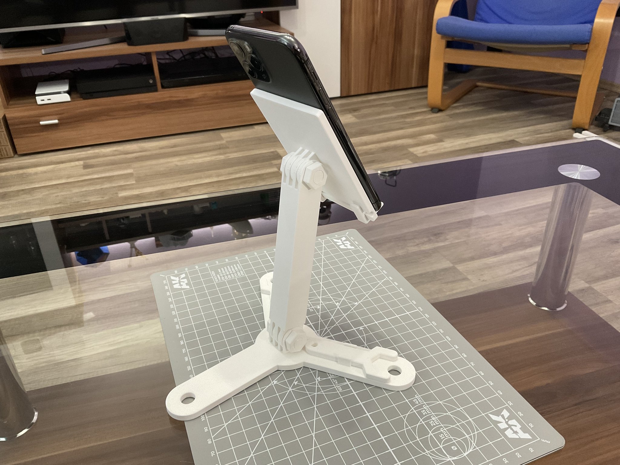 Giá đỡ nghiêng mô-đun cho máy tính bảng hoặc điện thoại di động. Có thể in ở hai chiều cao khác nhau. Mô hình cũng đi kèm với các chìa khóa siết cho vít và đai ốc. Tất cả đều đã được in và bạn không cần bất kỳ vật phẩm mua nào!. Tôi sẽ dần dần mở rộng mô hình này với nhiều thành phần hơn.