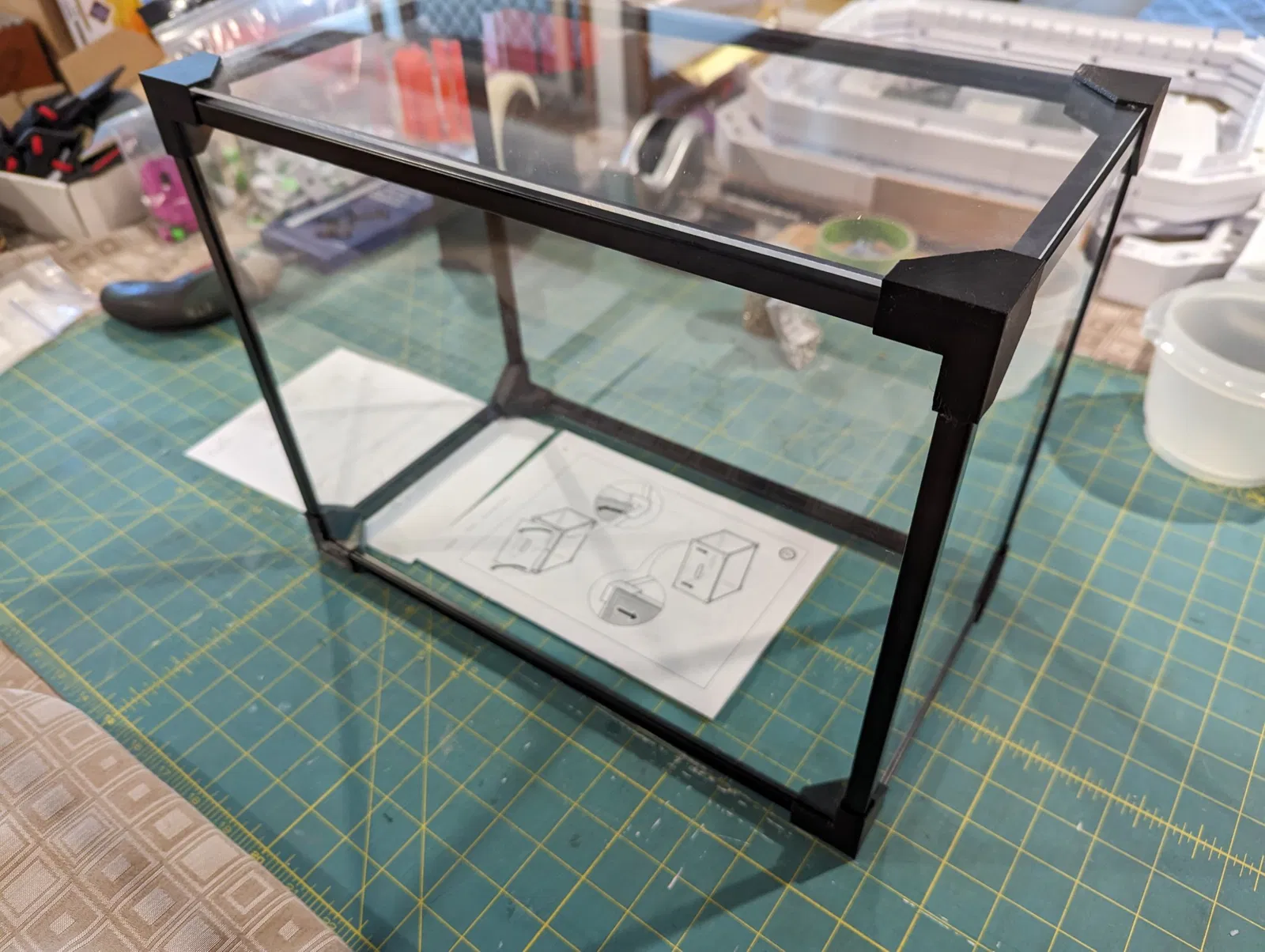 Tôi có thêm mấy cái "kệ" dày 4.5mm để đồ có thể đặt lên trên đó được. Mấy cái kệ này tui cắt laser rồi dán mấy cục vuông 5.5mm x 5.5mm đúng chiều dài vô mấy cái cột nhôm để chống lên thôi (cái này bạn có thể làm trực tiếp trên mấy cái slicer đó). Mấy cái kệ tui làm thêm thì tui có khoét lỗ ở phía sau để luồn dây đèn nếu bạn có hoặc cần nha. Nếu không có máy cắt laser thì bạn cứ làm không có tấm ván, để đồ trực tiếp lên mặt dưới của cái hộp là được.