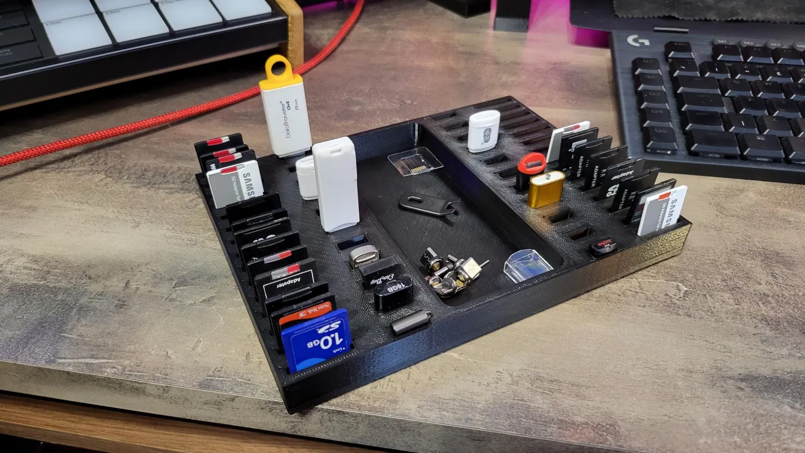 Một bộ nhớ USB lớn và giá đỡ thẻ SD. Giữ 30 thẻ SD và 20 thanh bộ nhớ USB