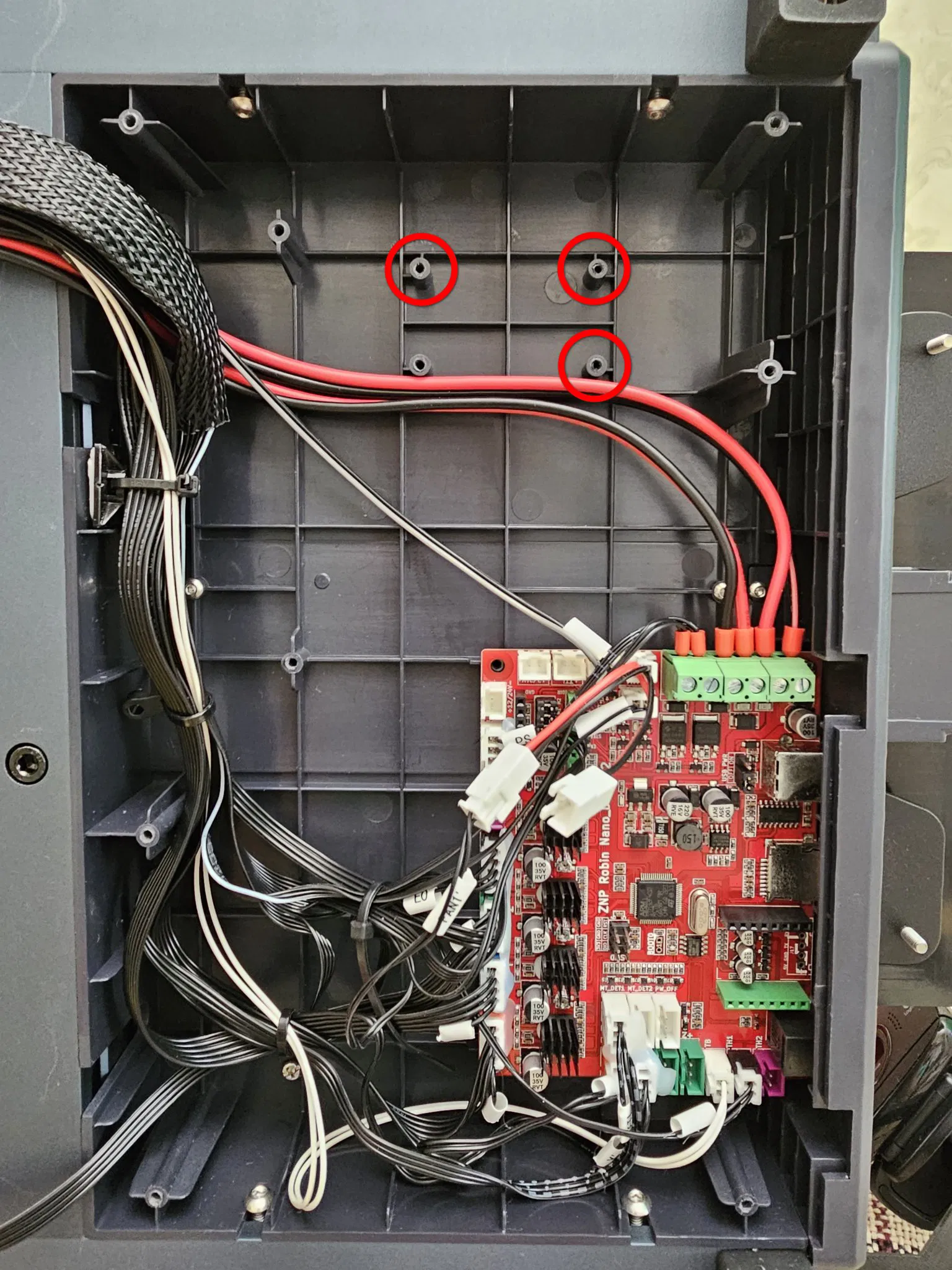Bạn cần vặn chặt giá đỡ vào các điểm đã đánh dấu bằng 3 10 mm vít tự khoan (hoặc tương đương). Sau đó, bạn cần vặn Buck Converter LM2596 vào các vít tự khoan 2.5 10 mm (hoặc tương đương). Tôi khuyên bạn nên sử dụng dây buộc nylon để cố định các dây nguồn. Chúng phải được lắp đặt trước khi vặn chặt giá đỡ.