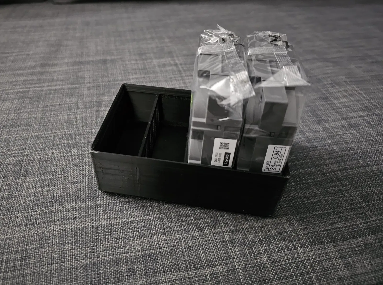 Chứa 4 cartridge máy in Brother kiểu TZ (24mm/~1 inch) trong một không gian Gridfinity 2x3. Chúng được giữ 'theo chiều dọc' để chiếm tối thiểu các ô Gridfinity trên bảng cơ sở của bạn.