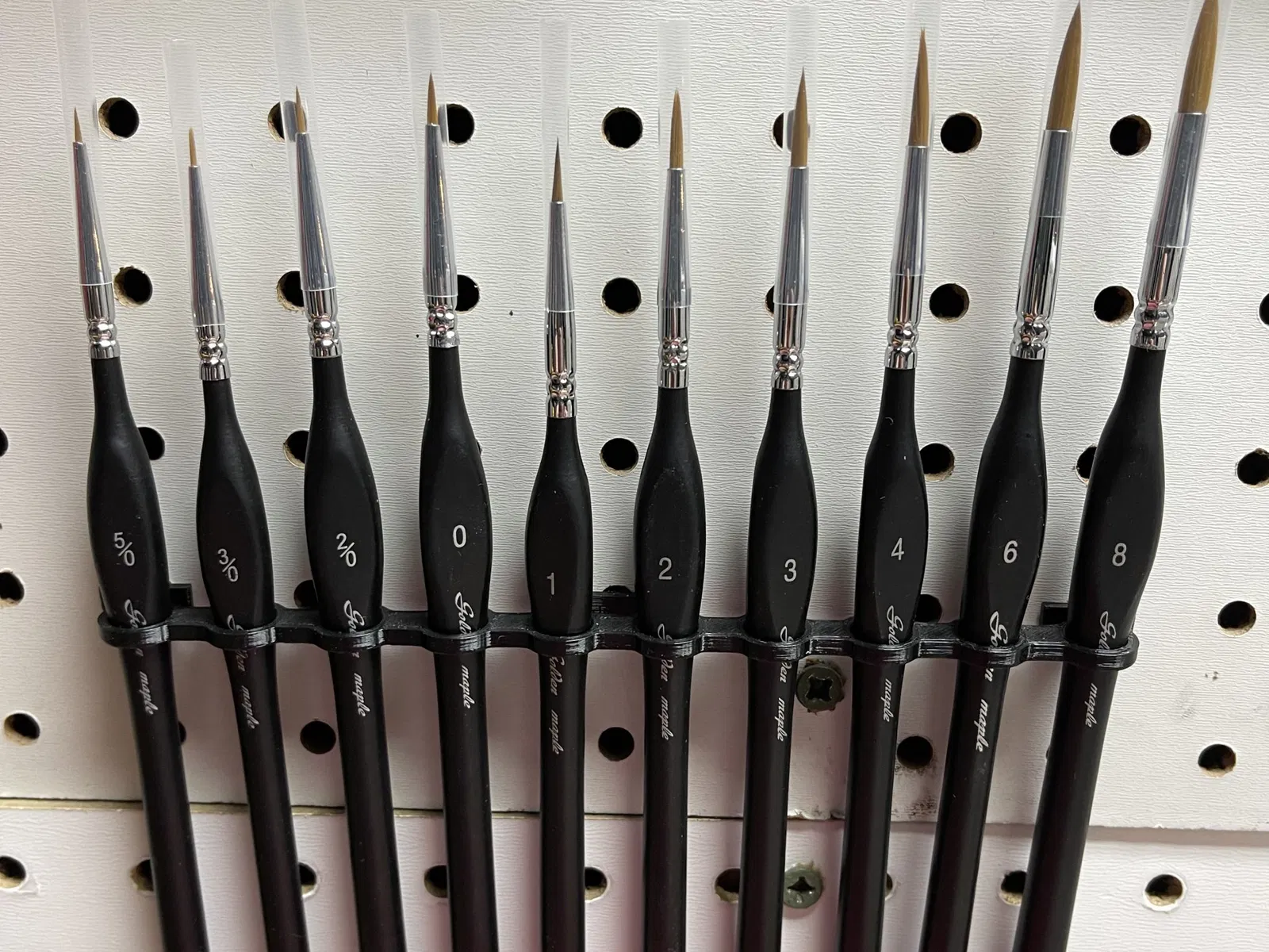 Tôi cần một cách để tổ chức các cọ vẽ chi tiết của mình trên bảng đục lỗ, vì vậy tôi đã thiết kế giá đỡ này. Có thể chứa tối đa 10 cọ vẽ. Không cần hỗ trợ.
