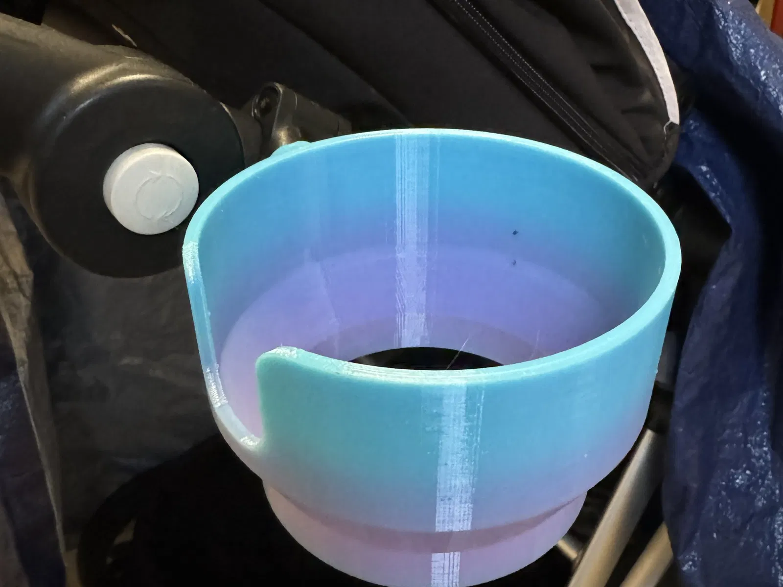 Cắt vào phía trước của kẹp cốc là để cho tay cầm và giảm bớt chiều rộng vì xe đẩy đã rất chật khi đi qua cửa.