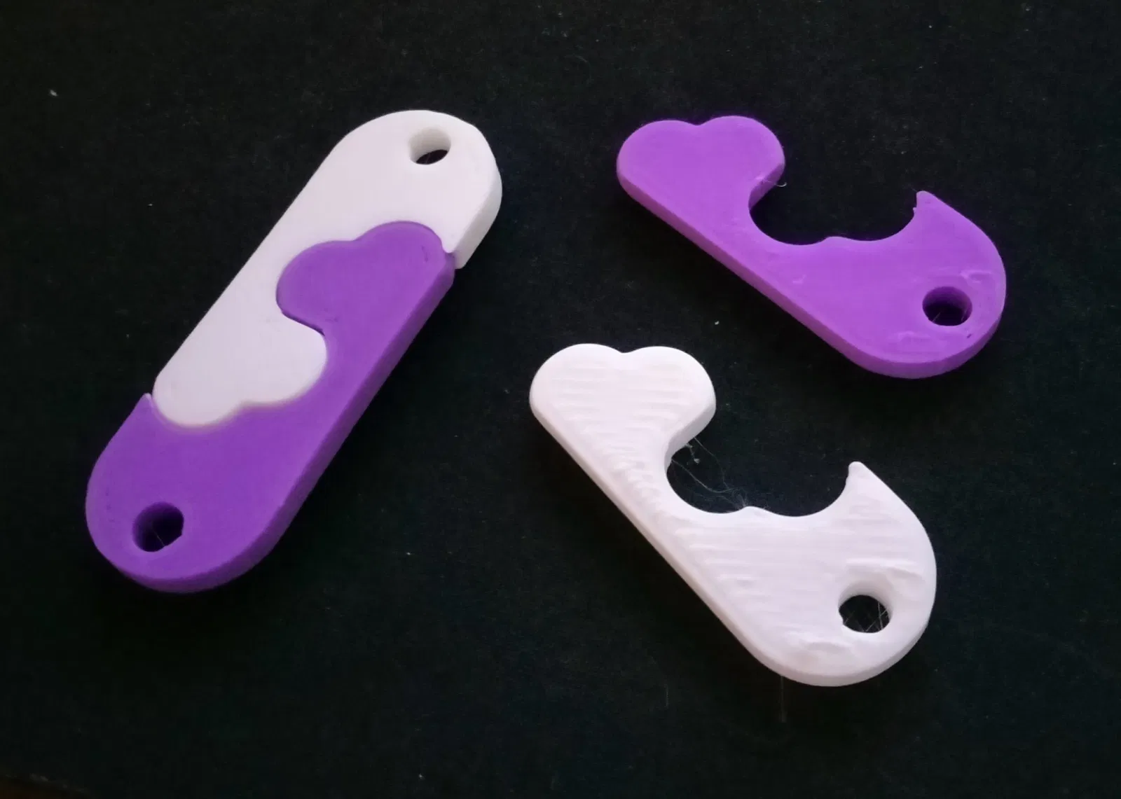 Một móc chìa khóa gồm hai mảnh ghép lại với nhau bằng hình trái tim.