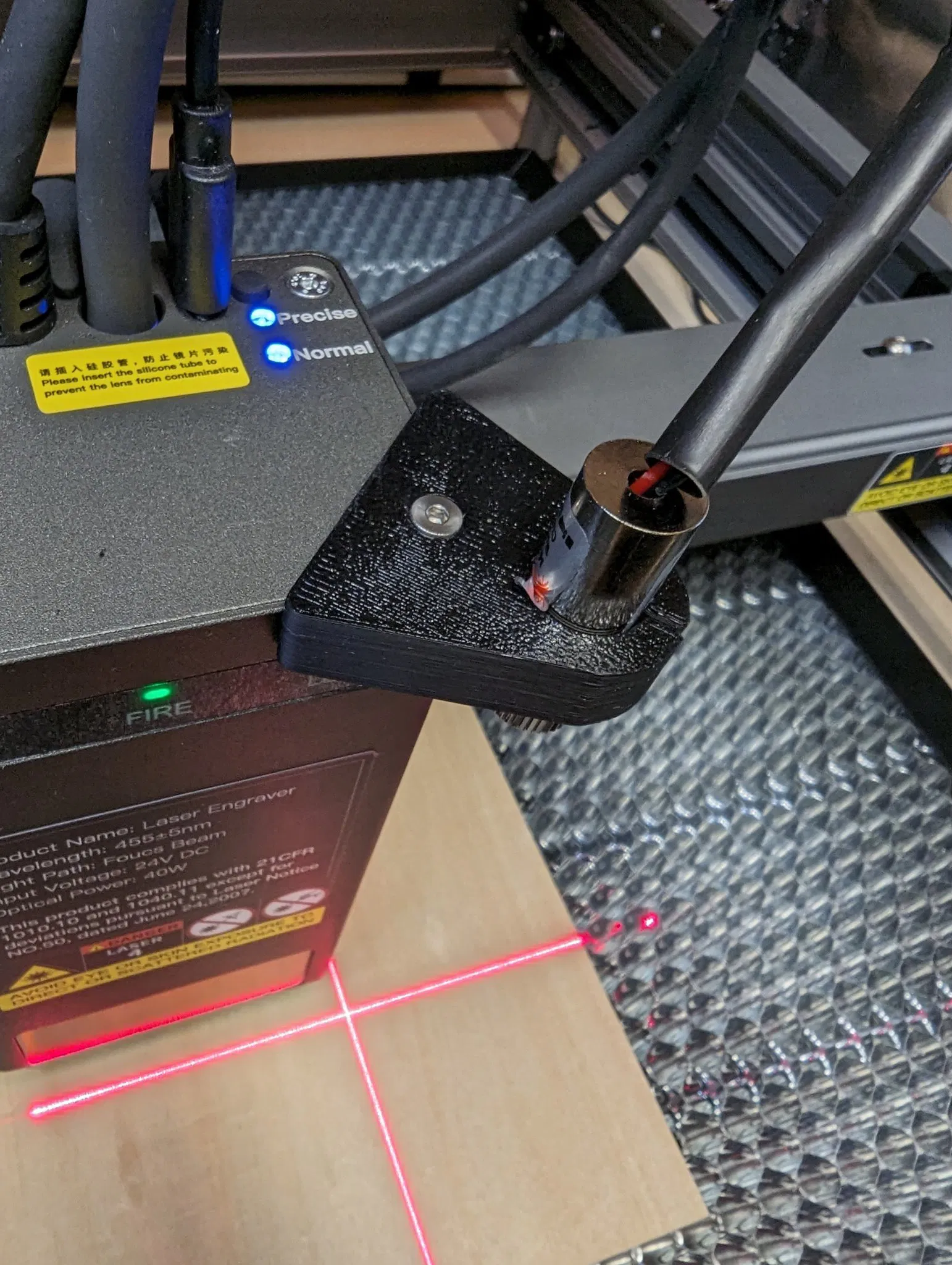 Được thiết kế để giữ mô-đun laze hình trụ tiêu chuẩn 12mm mà bạn tìm thấy trên các trang như Amazon hoặc AliExpress. Cần thay thế vít đầu phẳng M3 5mm (FHSCS) bằng một cái 8mm hoặc 10mm. Laze có độ khít chặt. Các mô-đun laze 5V có thể được kết nối với cổng USB-C ở trên cùng của mô-đun laze. Điều này có thể được gắn ở góc trước bên phải hoặc bên trái.